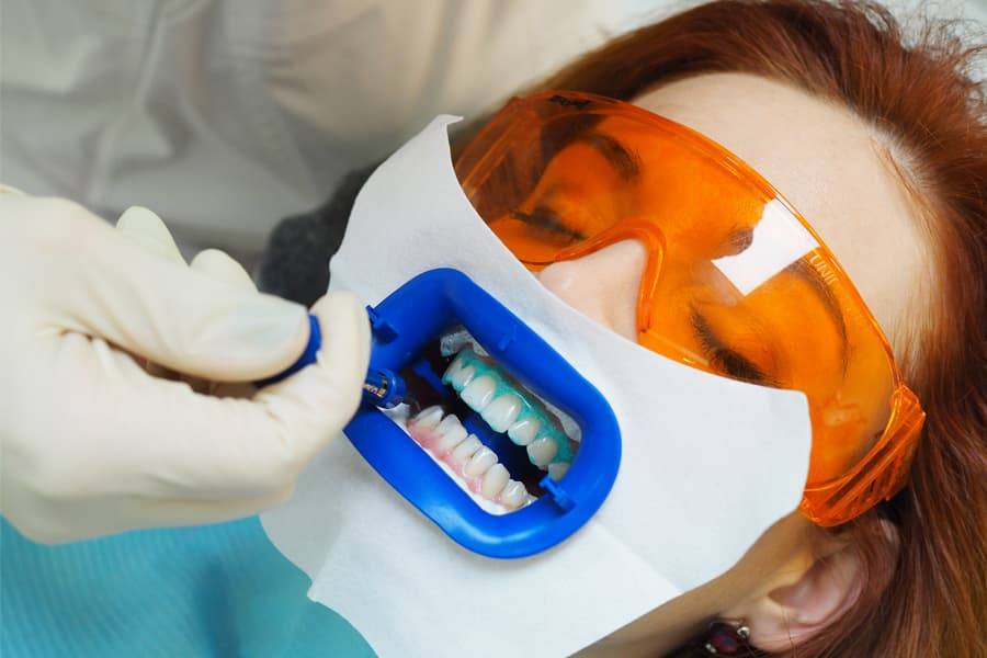 - Осмотр полости рта, проведение рентгенографического исследования и выявление возможных противопоказаний. В их число входят онкологические заболевание, сахарный диабет, аллергия на ультрафиолет, стоматологические болезни в активной стадии. Также отбеливание противопоказано беременным и людям младше 18 лет.