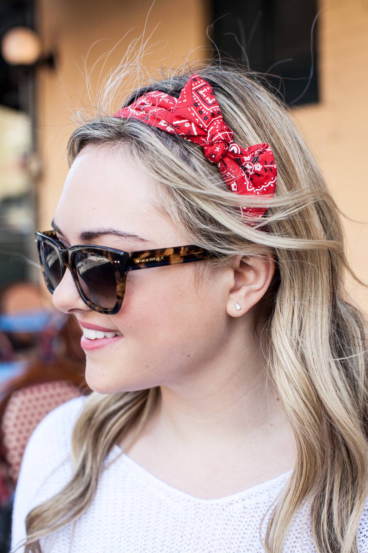 Этот способ часто используют девушки с короткой стрижкой, когда сложно собрать волосы в хвост. Бандана носится, как косынка – с узлом на затылке.