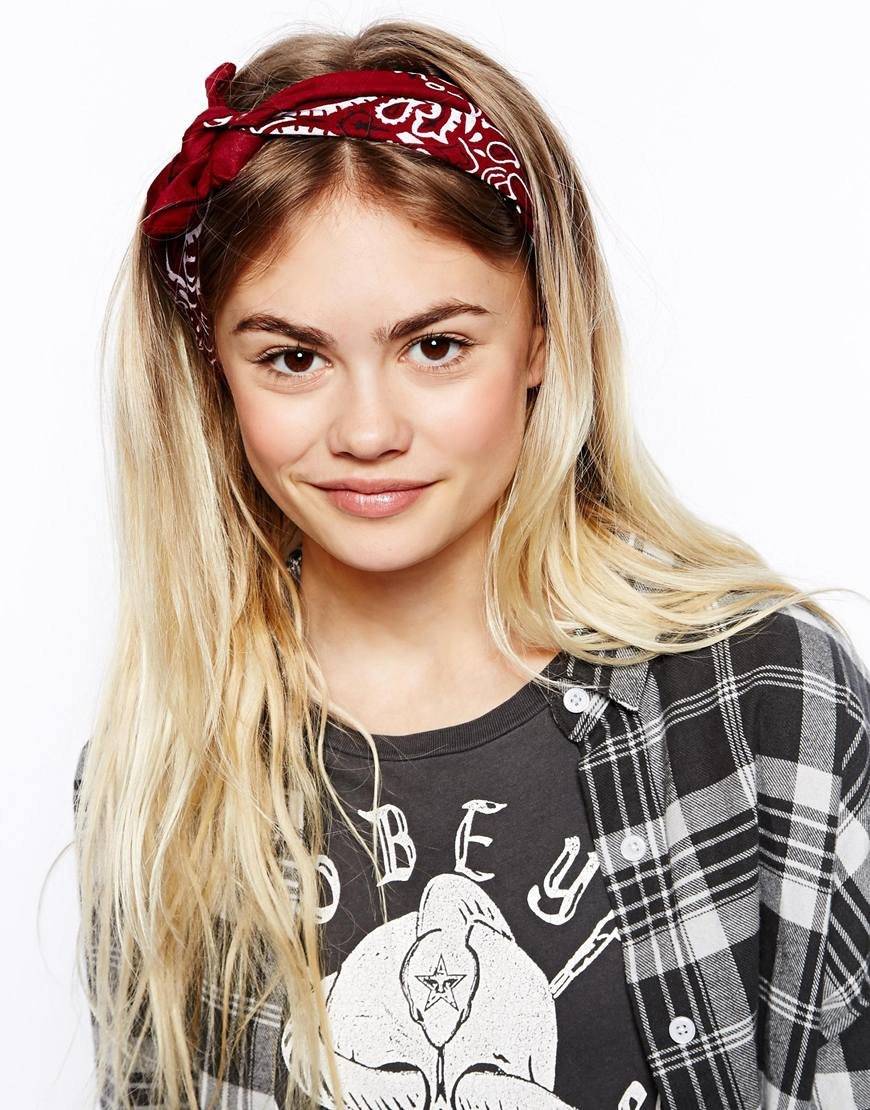 Банданой можно заменить ленты для волос и красиво дополнить необычный образ, вплетённым платком. Это отличная альтернатива ленте или ярких прядей для волос. Такой вариант отлично подойдёт для девушек с тонкими и необъёмными волосами, за счёт использования яркого тканевого элемента у вас увеличиться объём и прическа станет интереснее.