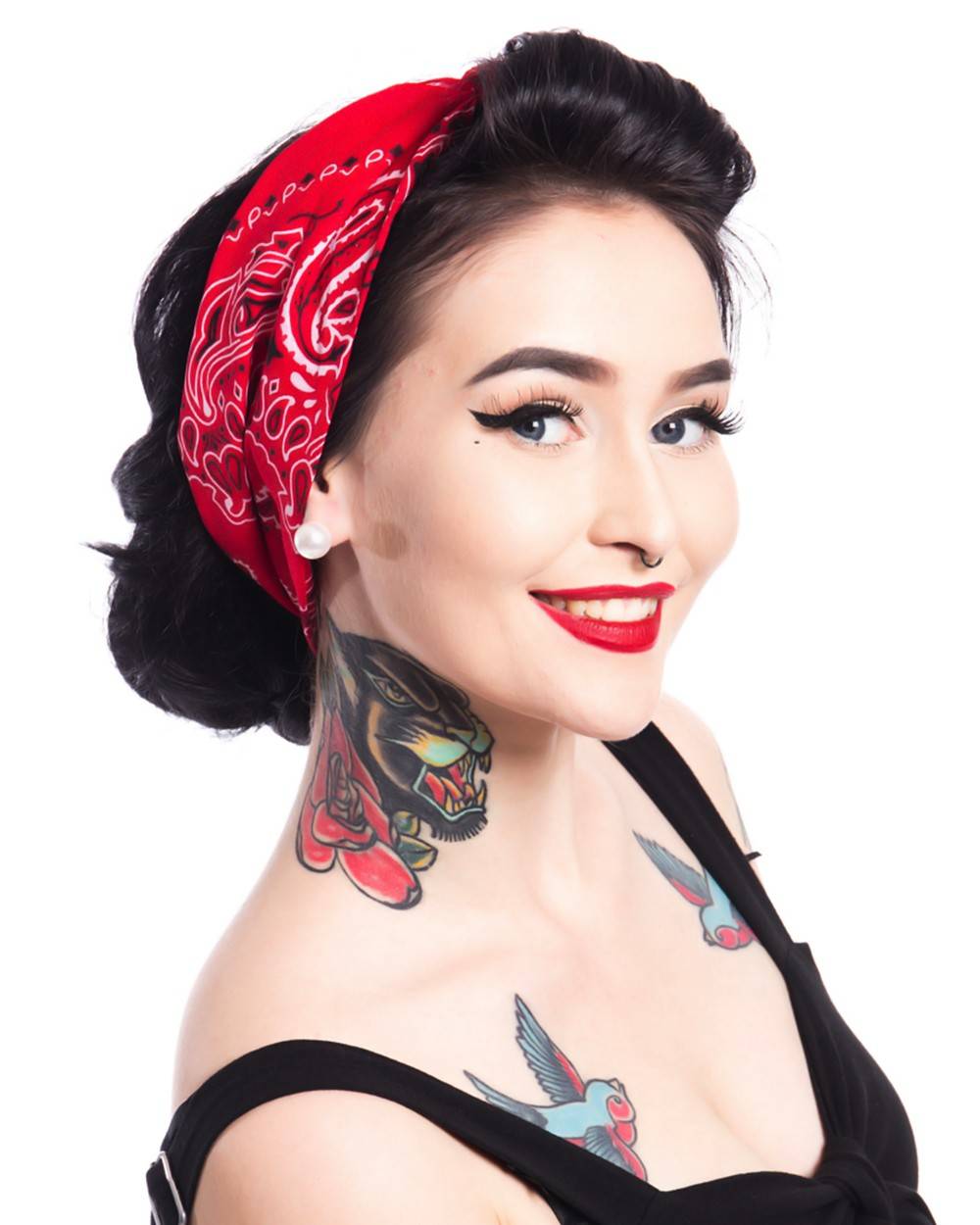 Очень женственно, чувственно и необычно будет выглядеть лук, в котором ключевым акцентом станет бандана, повязанная в стиле pin up. Для полноты образа можно добавить забранную наверх объемную челку и яркую помаду в макияже.