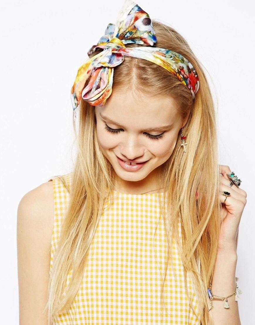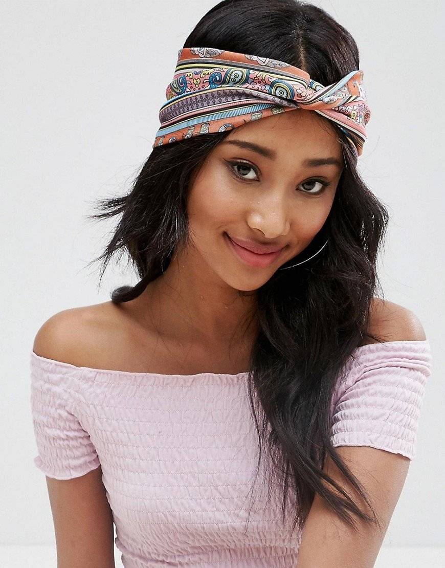 Этот способ очень простой и похож на классический. Он отлично сочетается с длинными волосами. Для этого метода можно использовать как яркую косынку, так и аксессуар сдержанных тонов. Отлично будет смотреться абстрактный принт.