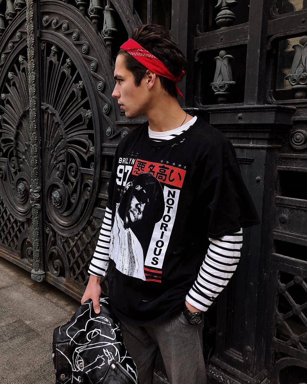 С банданой, повязанной полоской на голове, сочетаются мешковатые толстовки, джинсы, рубашки-поло, футболки, майки. Из обуви подойдут не только кроссовки и кеды. Отлично будут смотреться лоферы, оксфорды, челси.