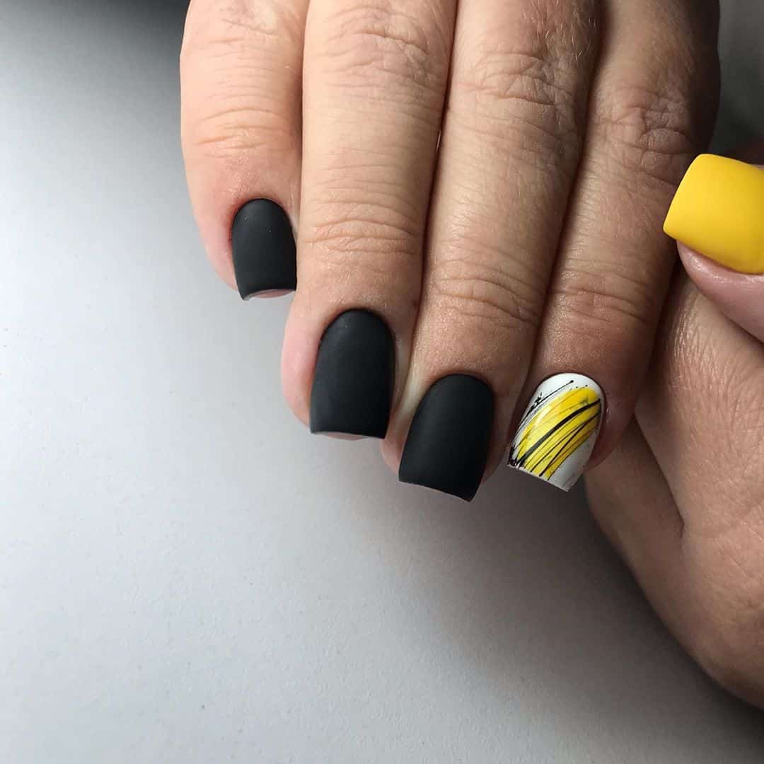 Черный цвет не менее актуален. Его можно использовать самостоятельно – для окрашивания ногтевых пластин, соседние с которыми заполняются темно-синим, или в градиенте, состоящим из этих же оттенков. Также хорошее сочетание – черные глянцевые и велюровые ногти. Чтобы сделать такой маникюр менее мрачным, можно добавить один белый матовый ноготок.