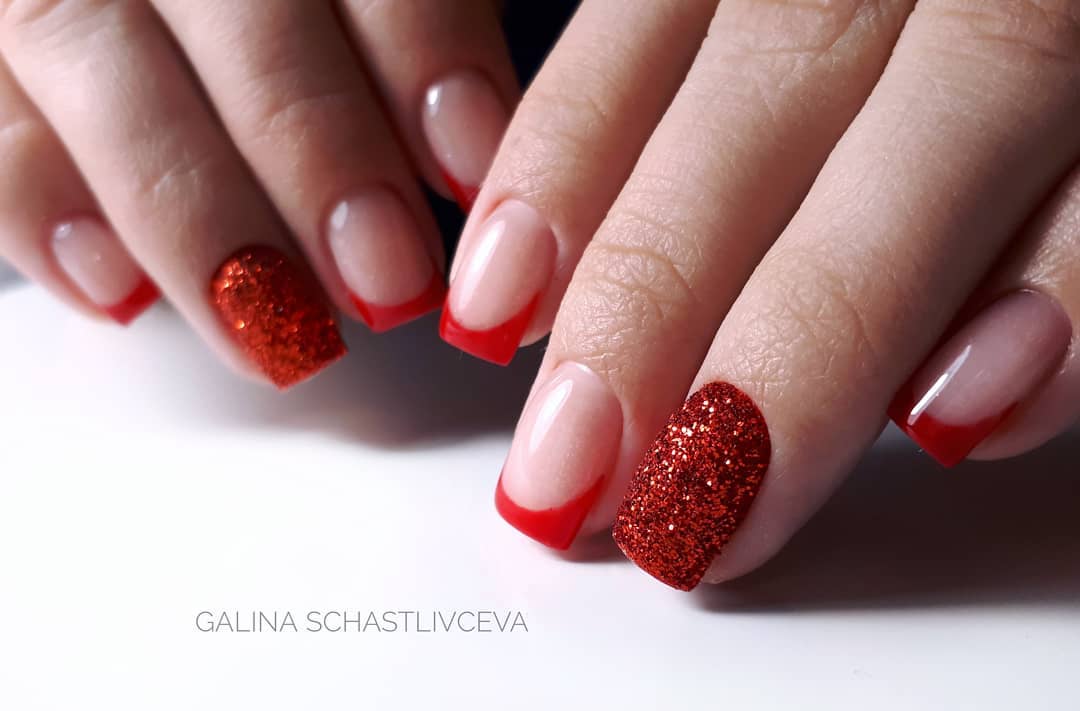 Использовать подобный вариант можно практически с любым лаковым покрытием (кроме ядовитых и слишком ярких оттенков, коричневых и блеклых). Положение френча возможно чередовать. В качестве украшений по краю могут быть блестки, мелкие стразы, фольга.