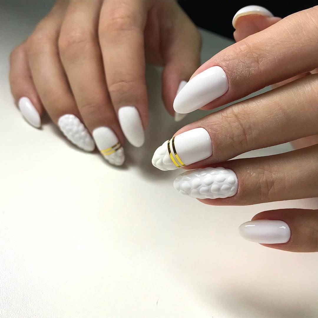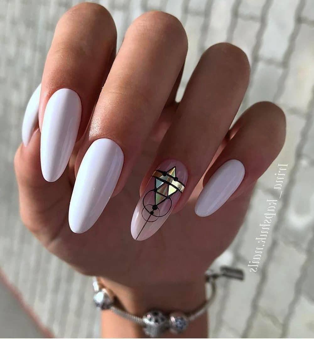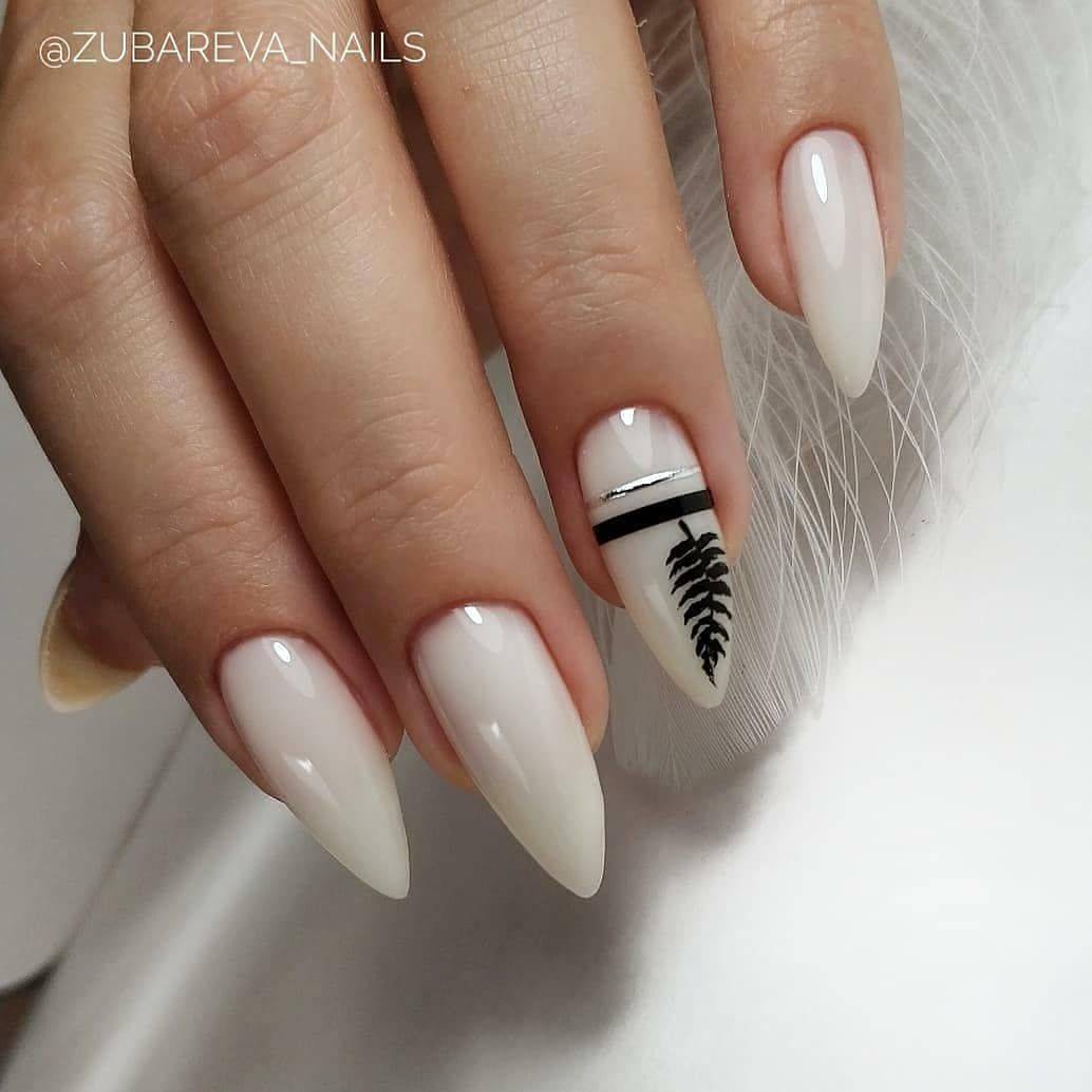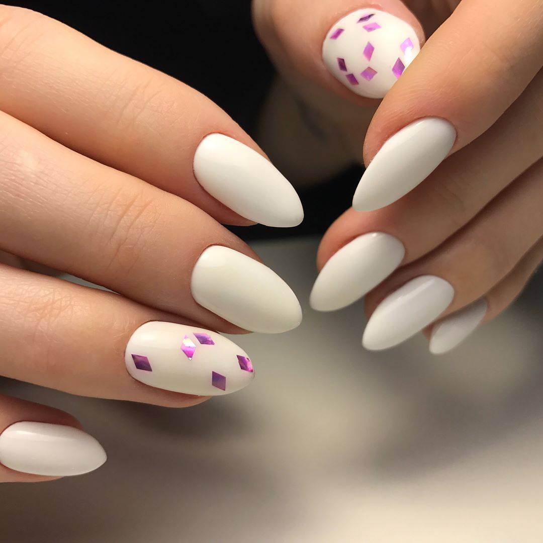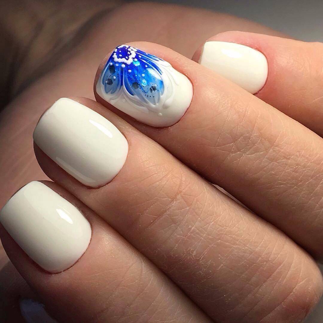 Дизайны ногтей со светлым покрытием не стоит перегружать множественными элементами декора. Благодаря богатой фактуре цвета, одно большое, яркое, акцентное пятно украшений смотрится гораздо выгоднее нескольких мелких.