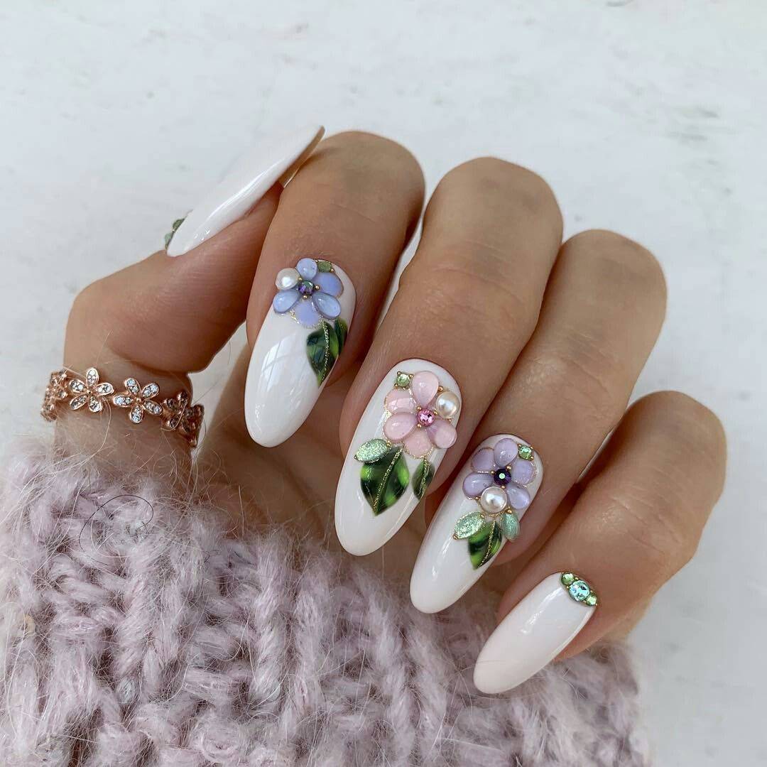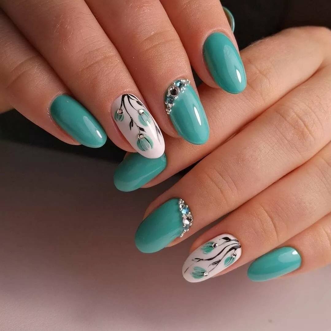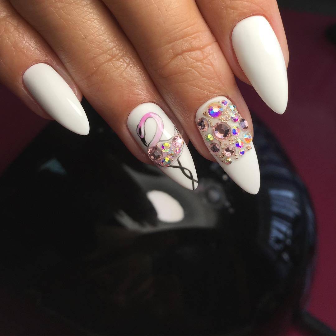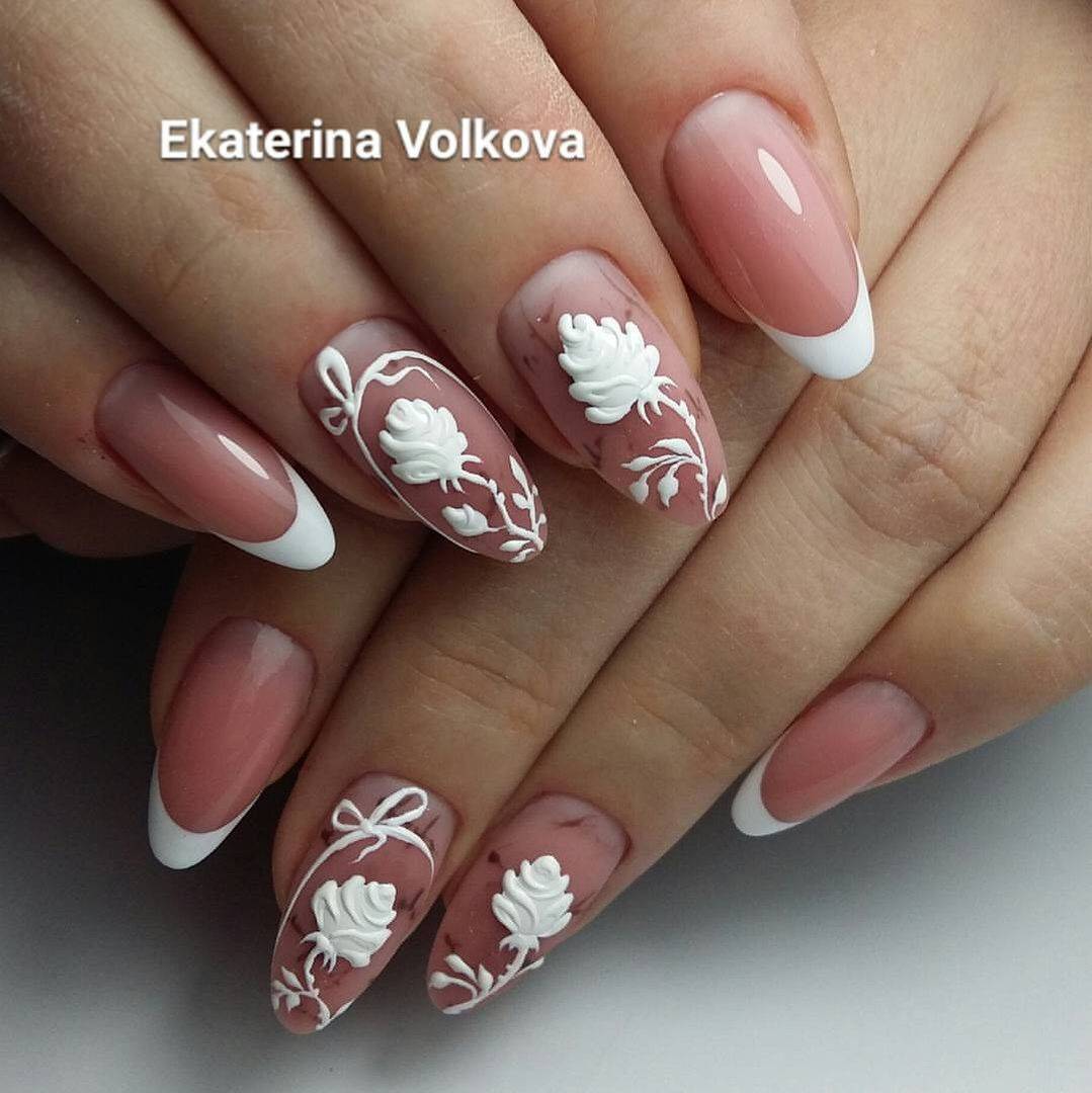 Дизайны ногтей со светлым покрытием не стоит перегружать множественными элементами декора. Благодаря богатой фактуре цвета, одно большое, яркое, акцентное пятно украшений смотрится гораздо выгоднее нескольких мелких.