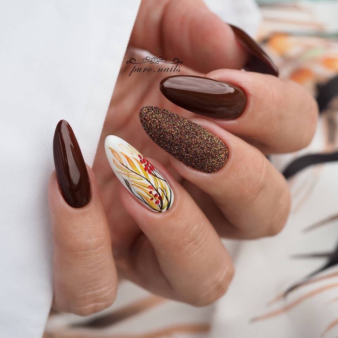 Благородный оттенок лака делает маникюр более глубоким, а золотая сетка на ногтях добавляет загадочности.