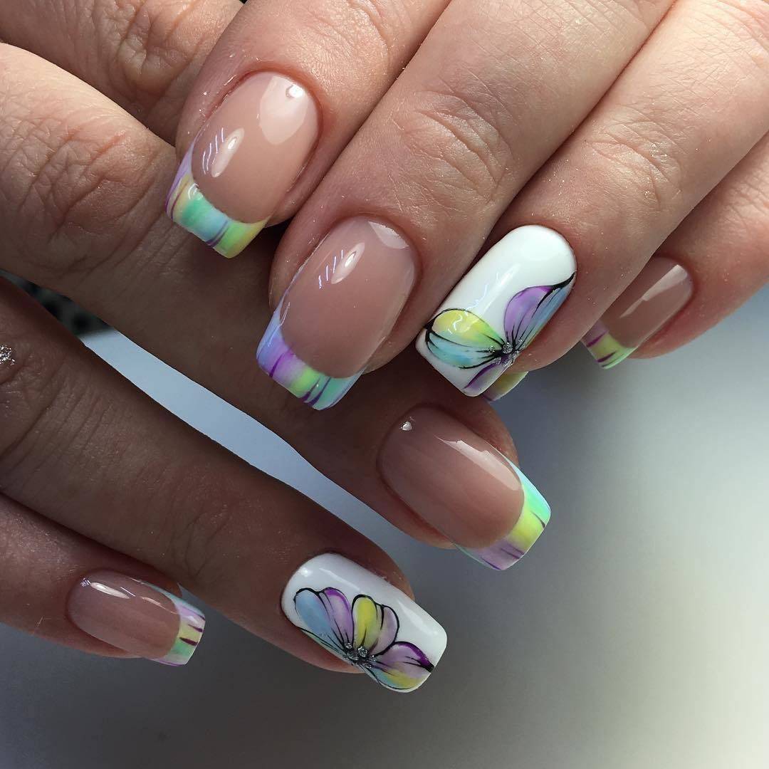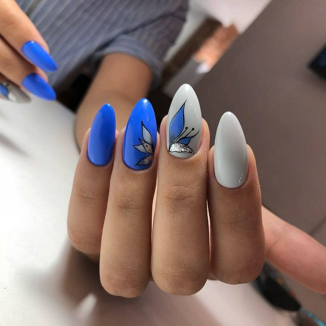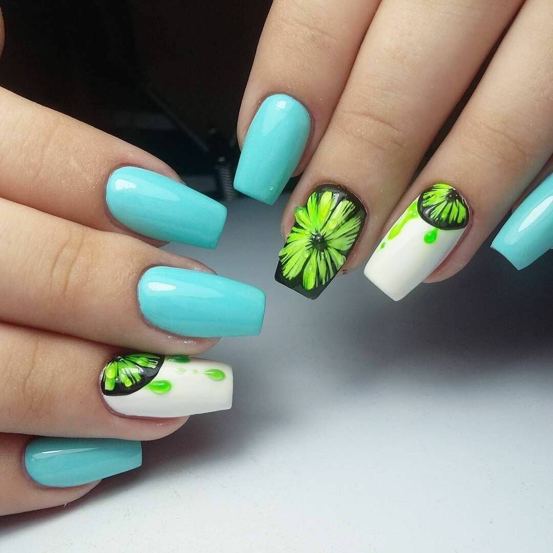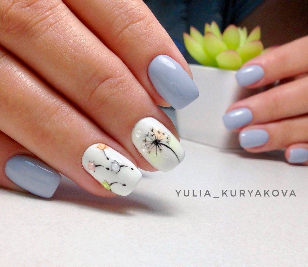 С цветами. Цветочками модницы чаще всего украшают свой весенний или летний педикюр. Такой дизайн сочетается с голубым маникюром, если выполнен в одинаковой стилистике. Но что касается дизайна ногтей рук, то голубым чаще всего будет именно весенний или летний маникюр.
