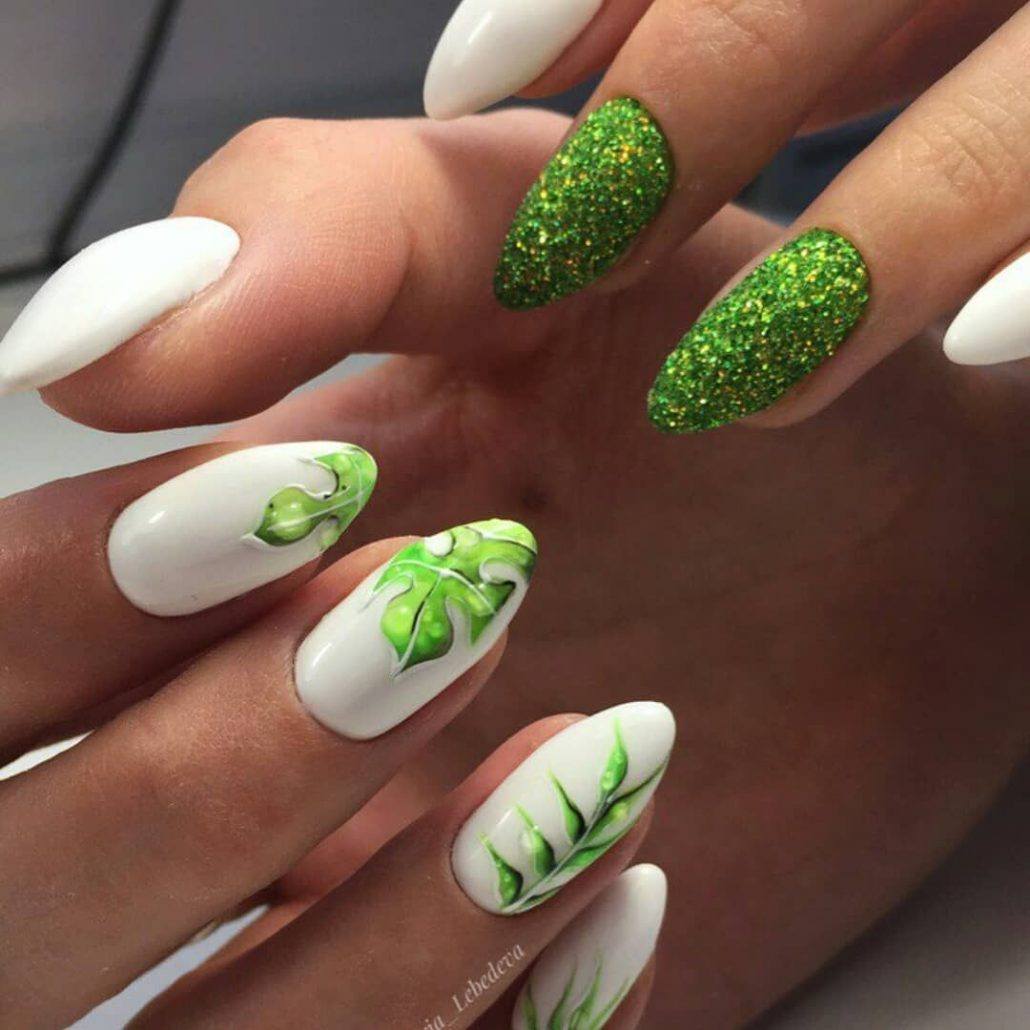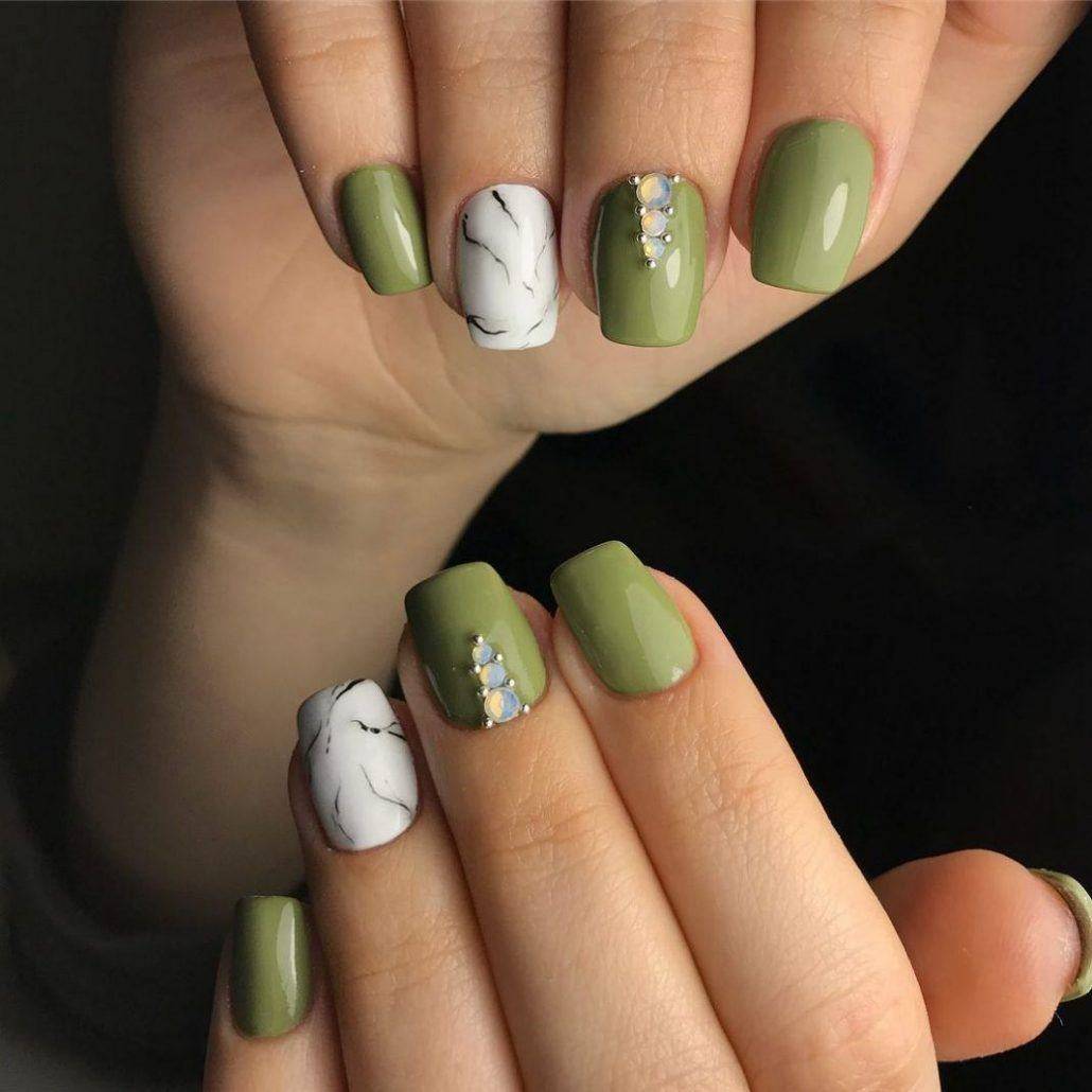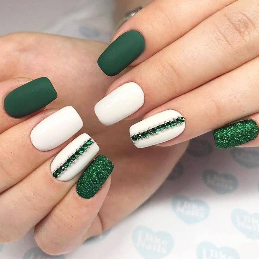 Очень интересно смотрятся вместе два самых модных оттенка — модный зеленый и новогодний золотой. Особенно интересный вариант получается, если почти весь ноготь покрасить зеленым лаком, а сбоку нарисовать небольшую золотую ленточку. Разве это не новогодний подарок любимому человеку?