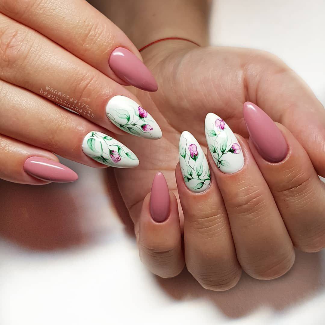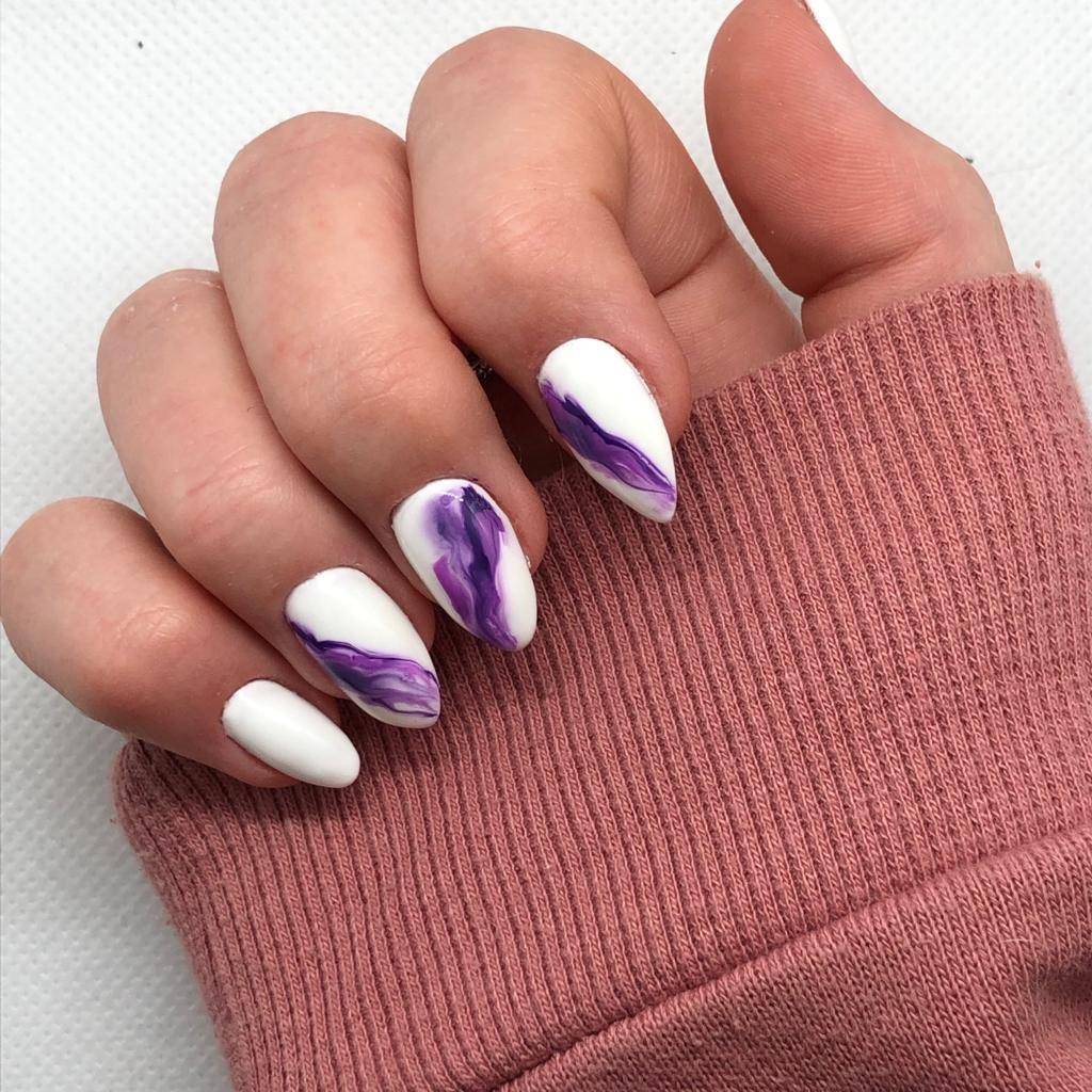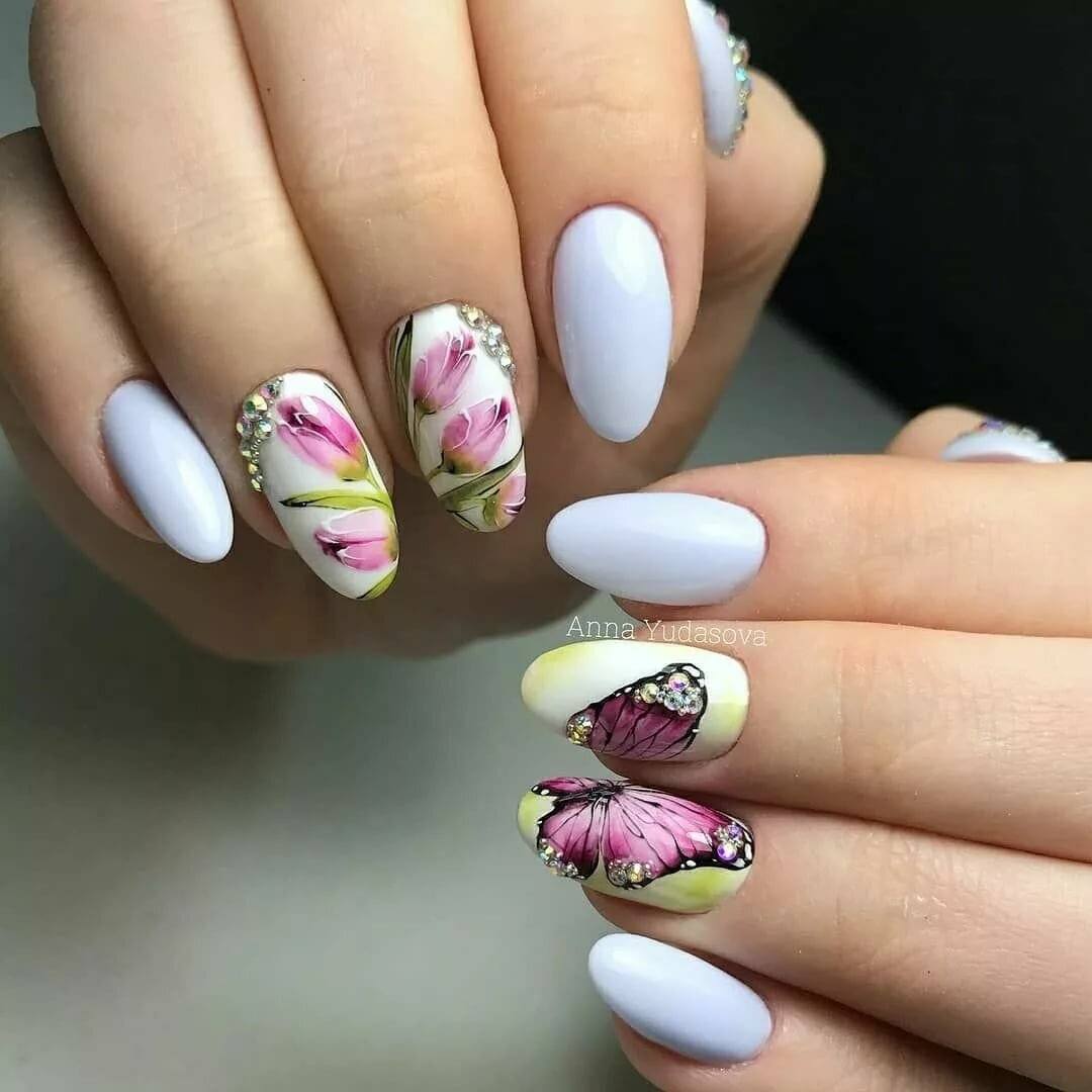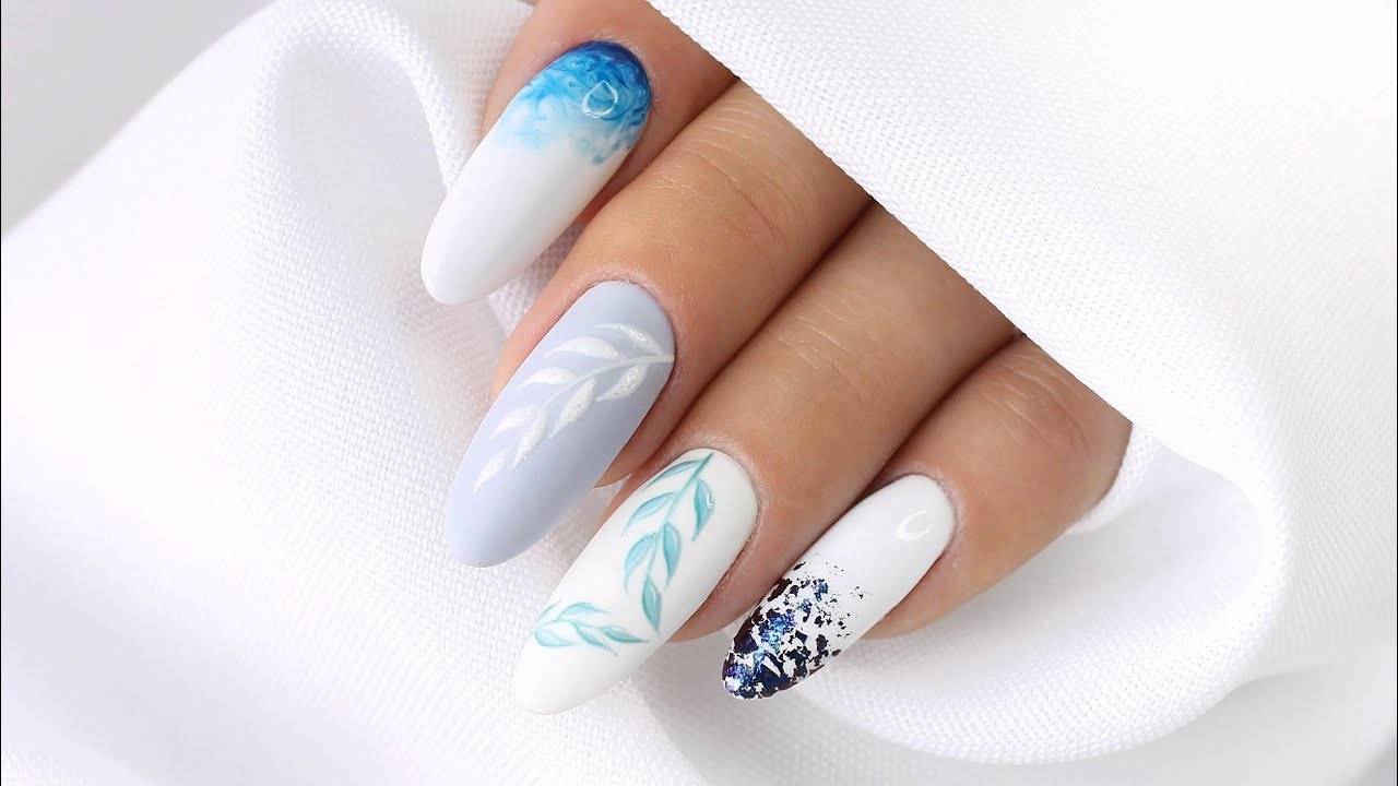 Необычными оригинальными узорами возможно украсить ногти в светлых тонах: это различные изображения цветов, растений, фруктов, ягод. Но, более всего, эти тона, а в особенности белый, подходят для рисунков в морской тематике.