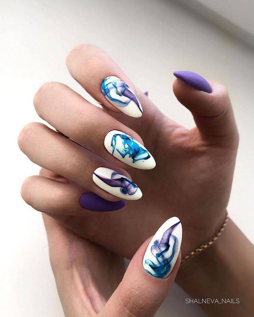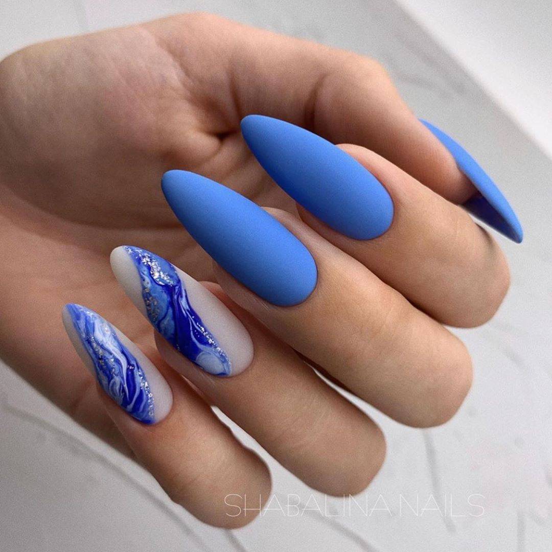 Лунный дизайн. Это тоже своего рода классика в дизайне ногтей. Чаще всего девушки останавливают свой выбор на голубом покрытии ногтей и выделении лунки в серебристые тона.