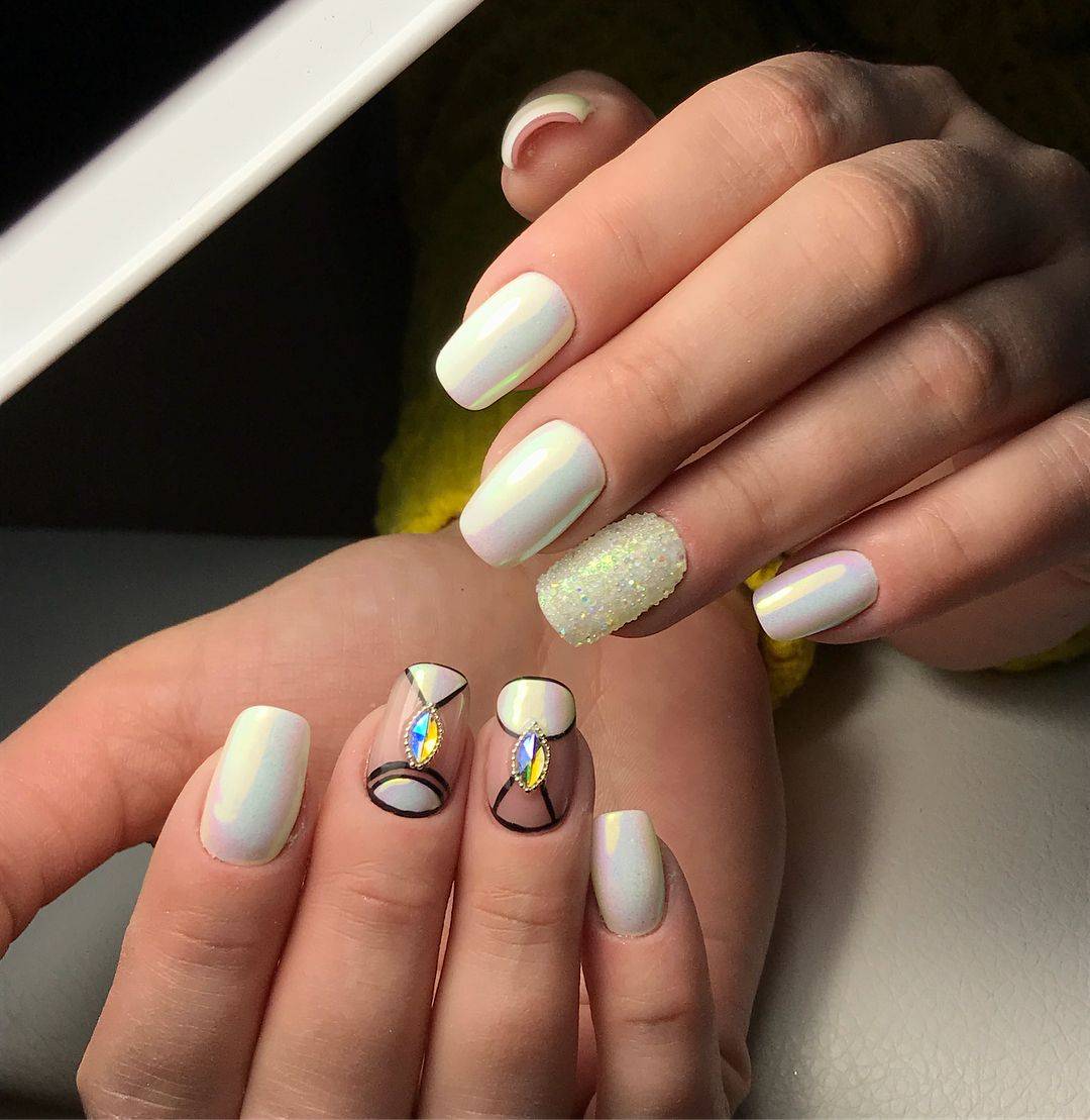 Дизайн втиркой пользуется огромной популярностью среди девушек, ведь это удивительно красивый и нежный материал, который изумительно красиво выглядит на белом фоне. Используйте для дизайна жемчужную втирку, которая подарит вашим ноготкам безумно красивые переливы драгоценных камней.