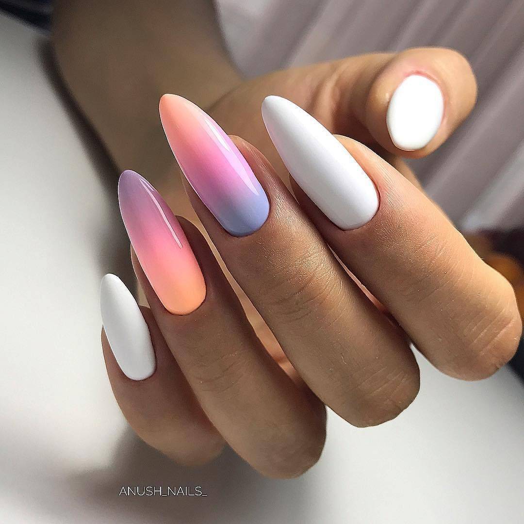 Градиентный маникюр — это не обязательно сочетание нескольких оттенков на одном ногте. Вы можете просто покрасить ногти в разные цвета, которые плавно перетекают друг в друга. Выбирайте из красного, розового или зеленого. А можно поиграть с апельсином, ведь впереди год Тигра Градиентный маникюр: как сделать самые модные ногти этого сезона