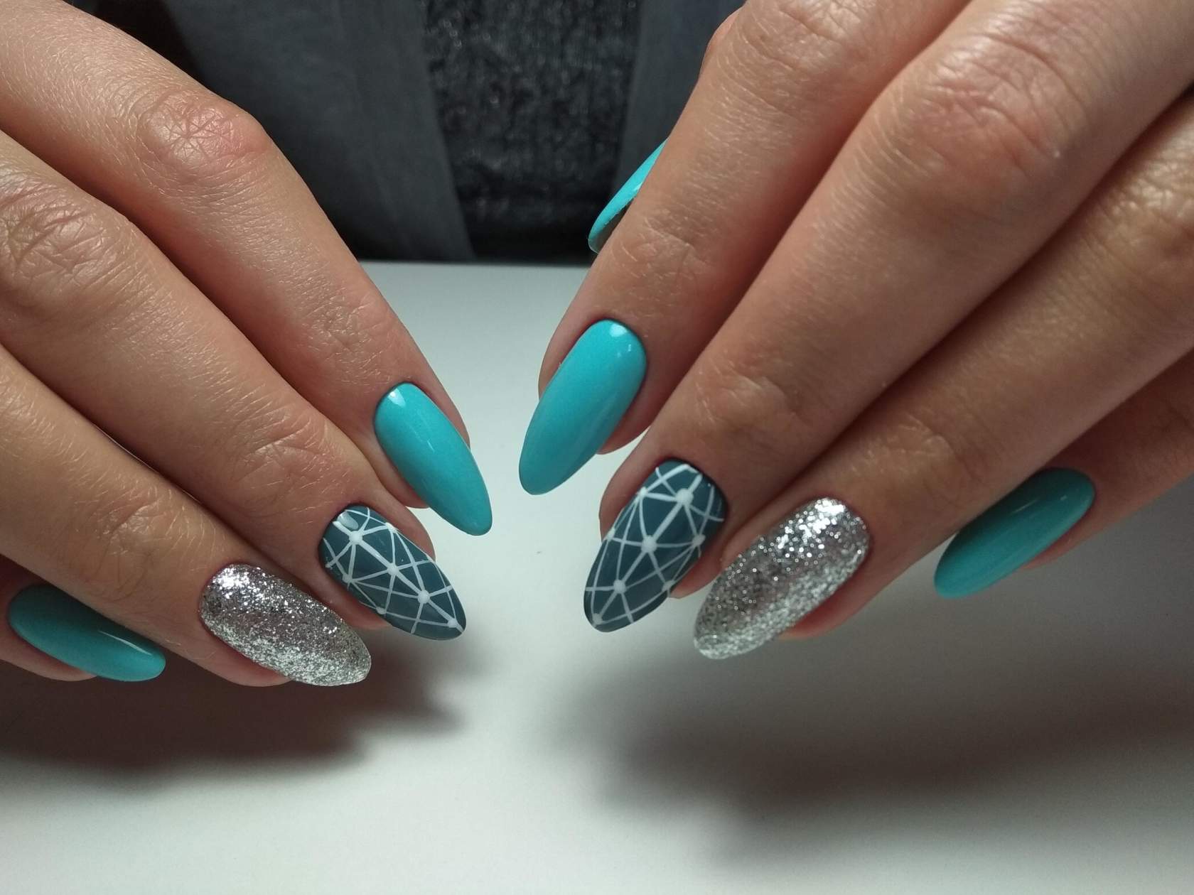 Изысканно смотрятся вставки с блестками, золотистые или серебристые линии и декорирующие элементы. Рекомендуется отдавать предпочтение контрастным оттенкам.