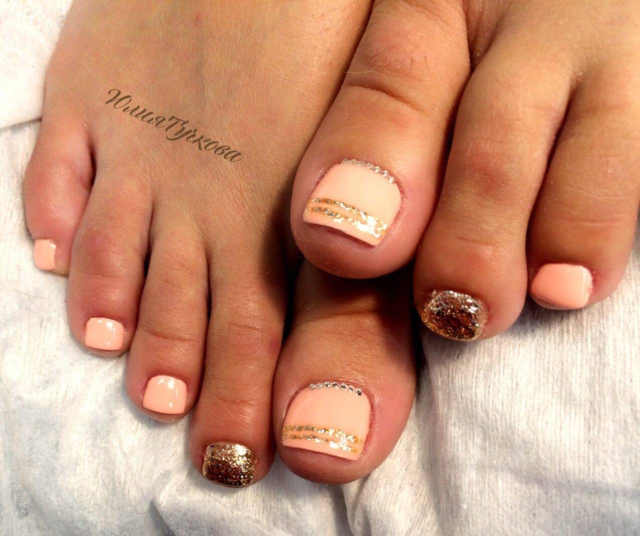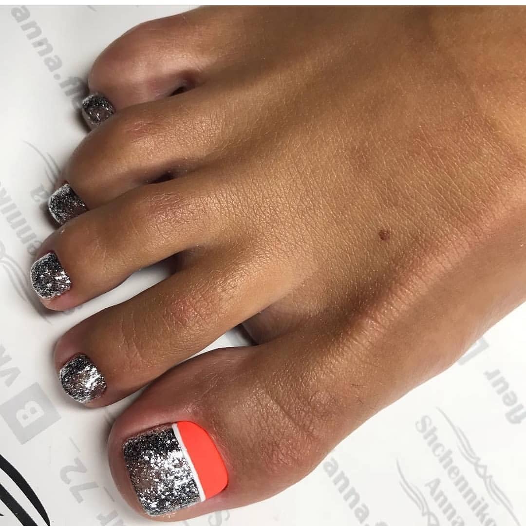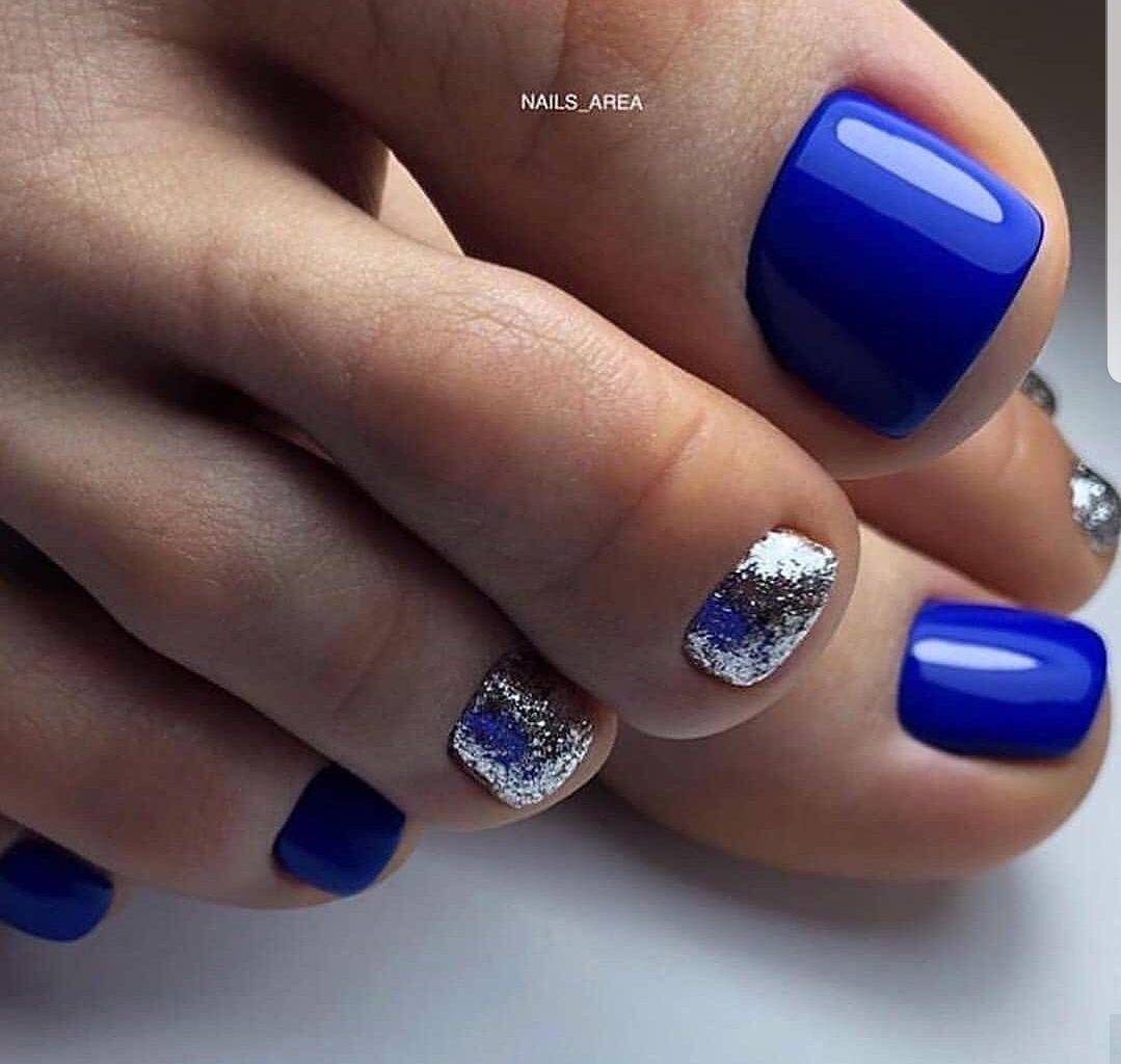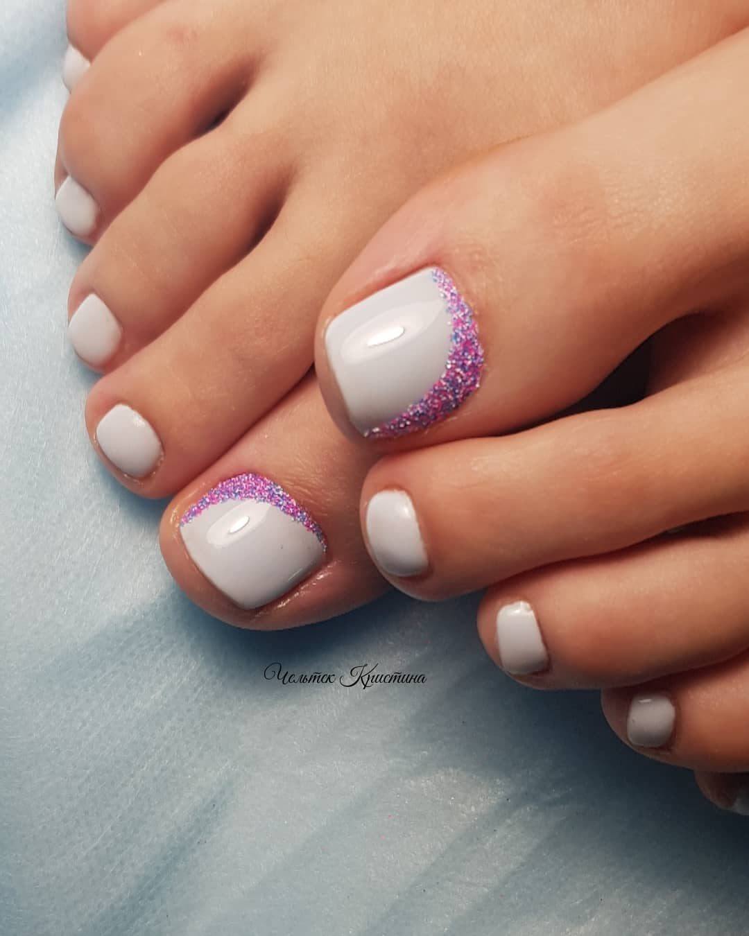 Очаровательно смотрятся педикюры с глитером, градиентом, очень подходящие для красивого новогоднего педикюра.