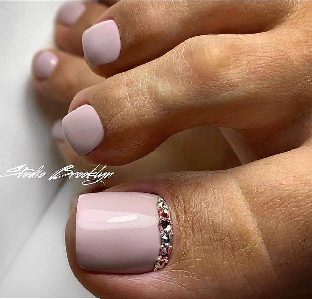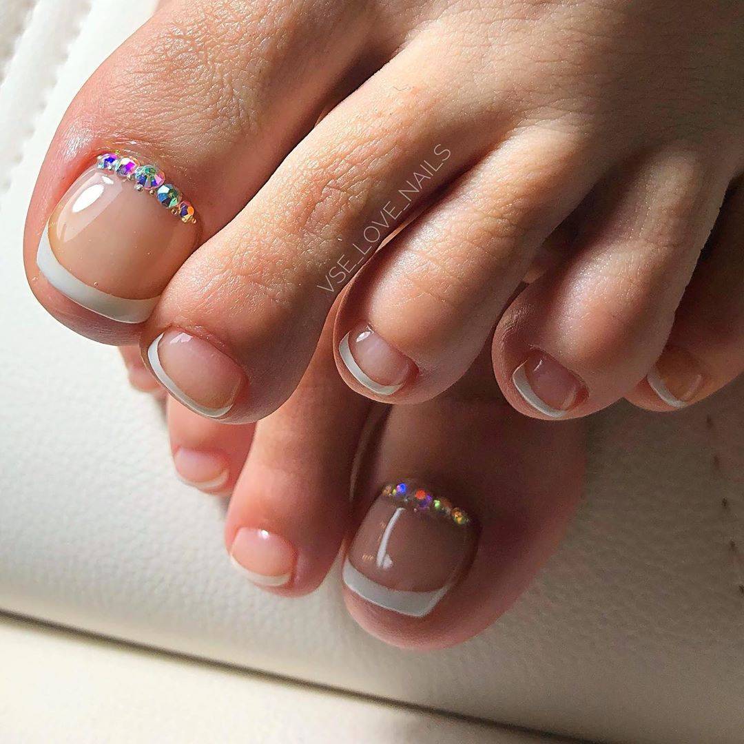 При выборе дополнительных элементов дизайна важно не переборщить, так как цвет и стиль педикюра изначально предполагает естественность. Для дизайна подойдет какой-то один элемент – например, одна или три стразы на большом пальце