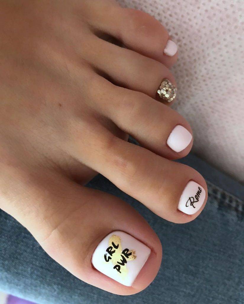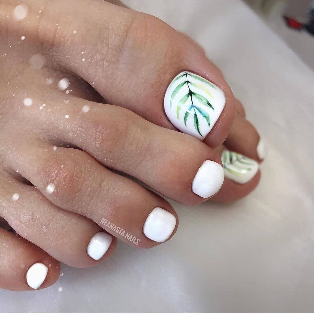 На белоснежную основу можно нанести полоски, а чтобы смотрелось ярче, можно дополнить цветочные слайдеры. Кроме того, к сочетанию черно-белых красок подойдет дополнение из других тонов, таких как ярко-розовый или желтый. Вы получите прекрасное сочетание, объединив в единую композицию белый цвет и розовый, такой педикюр подойдет девушке с романтичным характером, подчеркнув ее нежную натуру. Бело-розовое покрытие ногтей хорошо подходит к принту с цветочным рисунком и прекрасно впишется в весенний и летний стиль. С таким педикюром следует выдержать обязательное условие – розовый цвет должен присутствовать только в одном из предметов одежды или аксессуара.