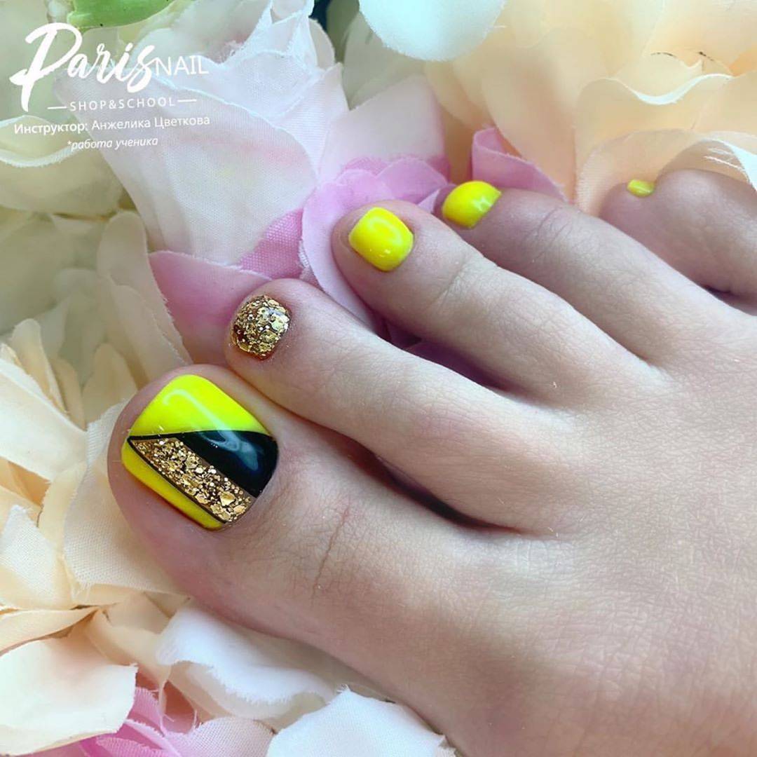 А становиться еще более ярким, а педикюр в таком сочетании выглядит сказочно. Например, в сочетании золотого с темными оттенками они дополняют друг друга, образуя великолепный дизайн.