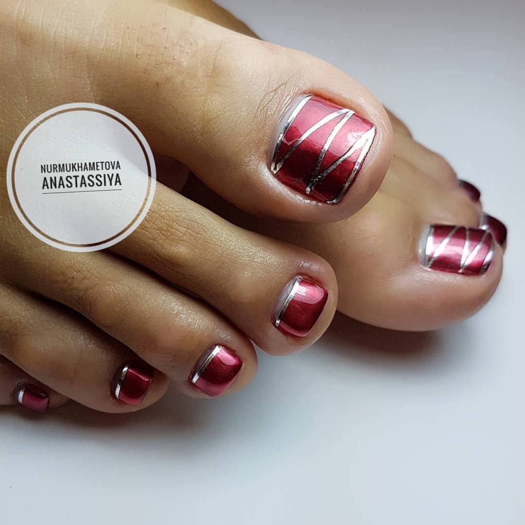 За такую универсальность его выделяют среди множества других оттенков. Для создания такого дизайна, возможно использовать лак, фольгу, а также глиттер, или втирку. Конечно такой тон сам по себе самодостаточный а также и без дополнения смотрится шикарно. Но если вы любительница сияющих дизайнов, можете немного разнообразить серебряное покрытие дополнив сияющим декором. Только будьте аккуратны и не переусердствуйте, так как фон и без дополнения яркий.В таком случае используйте минимум страз чтоб педикюр не выглядел через чур броско.
