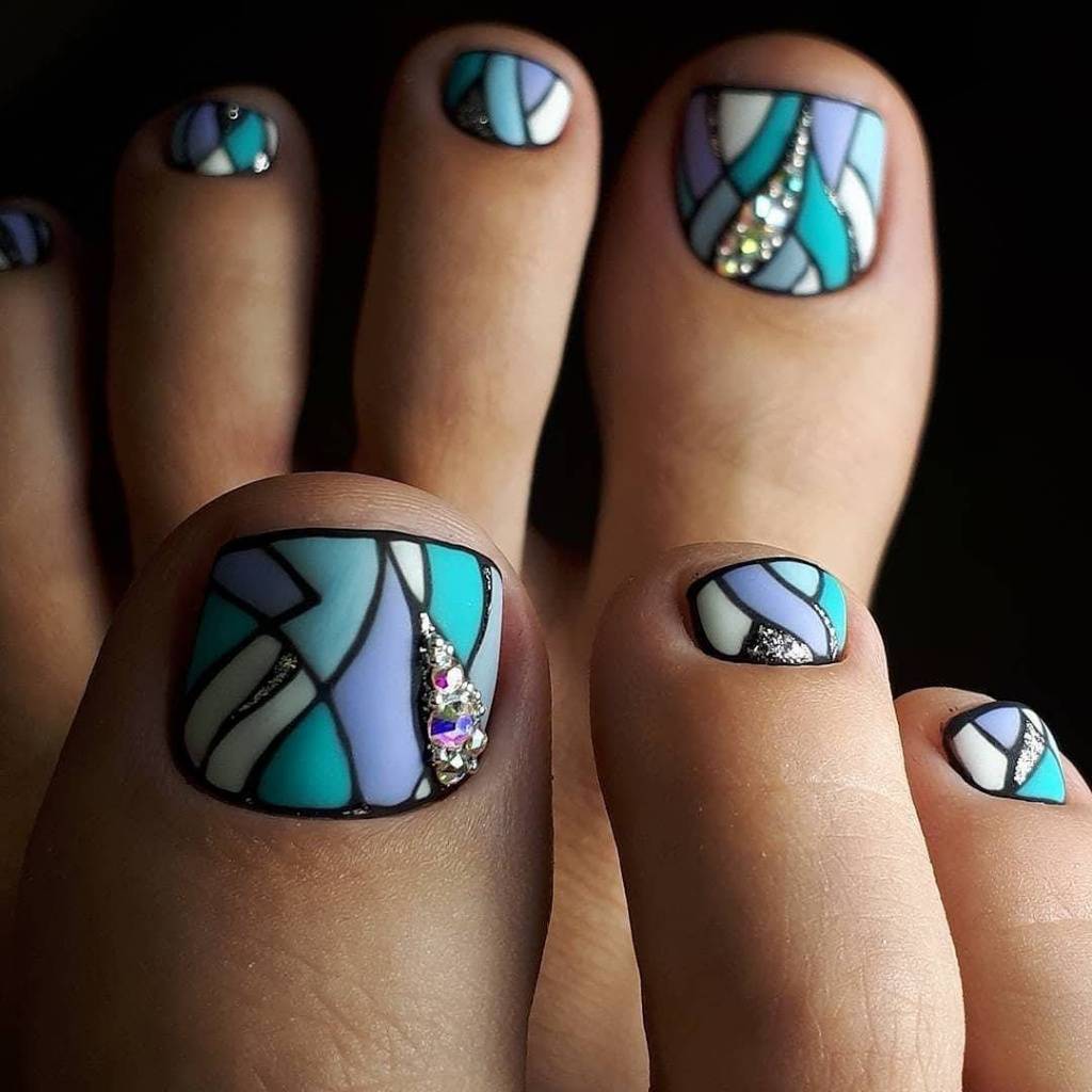 Красивый модный лунный педикюр, а также с геометрическими узорами. В дизайне педикюров очень модны фольга, сверкающая втирка, разноцветные точки (техника дотс).