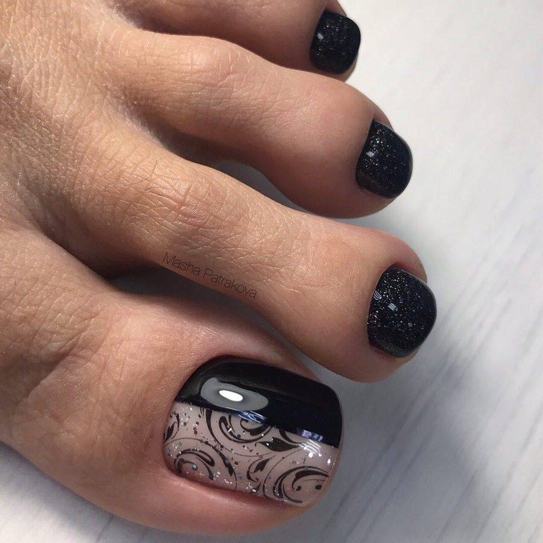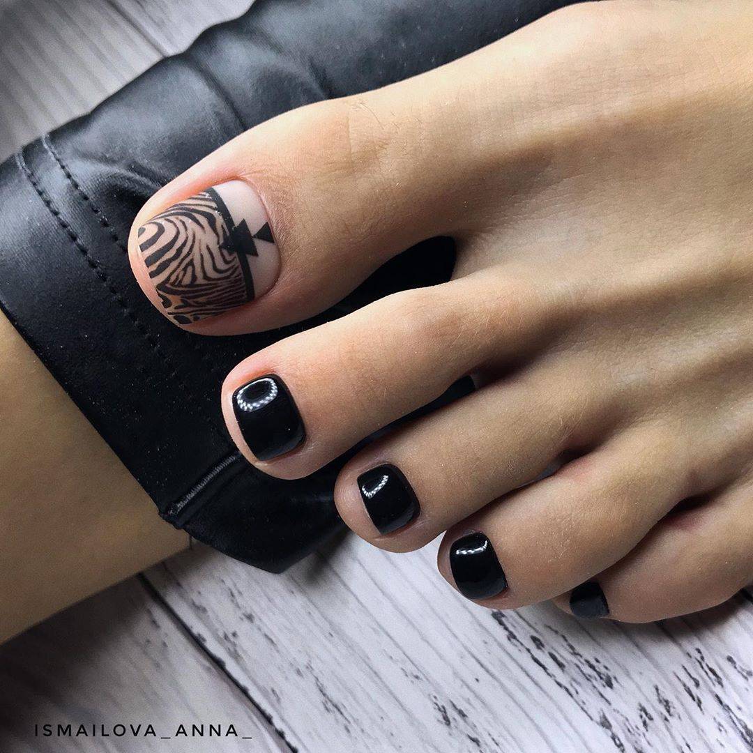 Чередование черного и белого ногтя давно стало классикой, и чтобы ее освежить, нужно лишь более изящно оформить пластину большого пальца ноги. Для этого используются плавные узорные линии, немного страз и мелких бусинок.