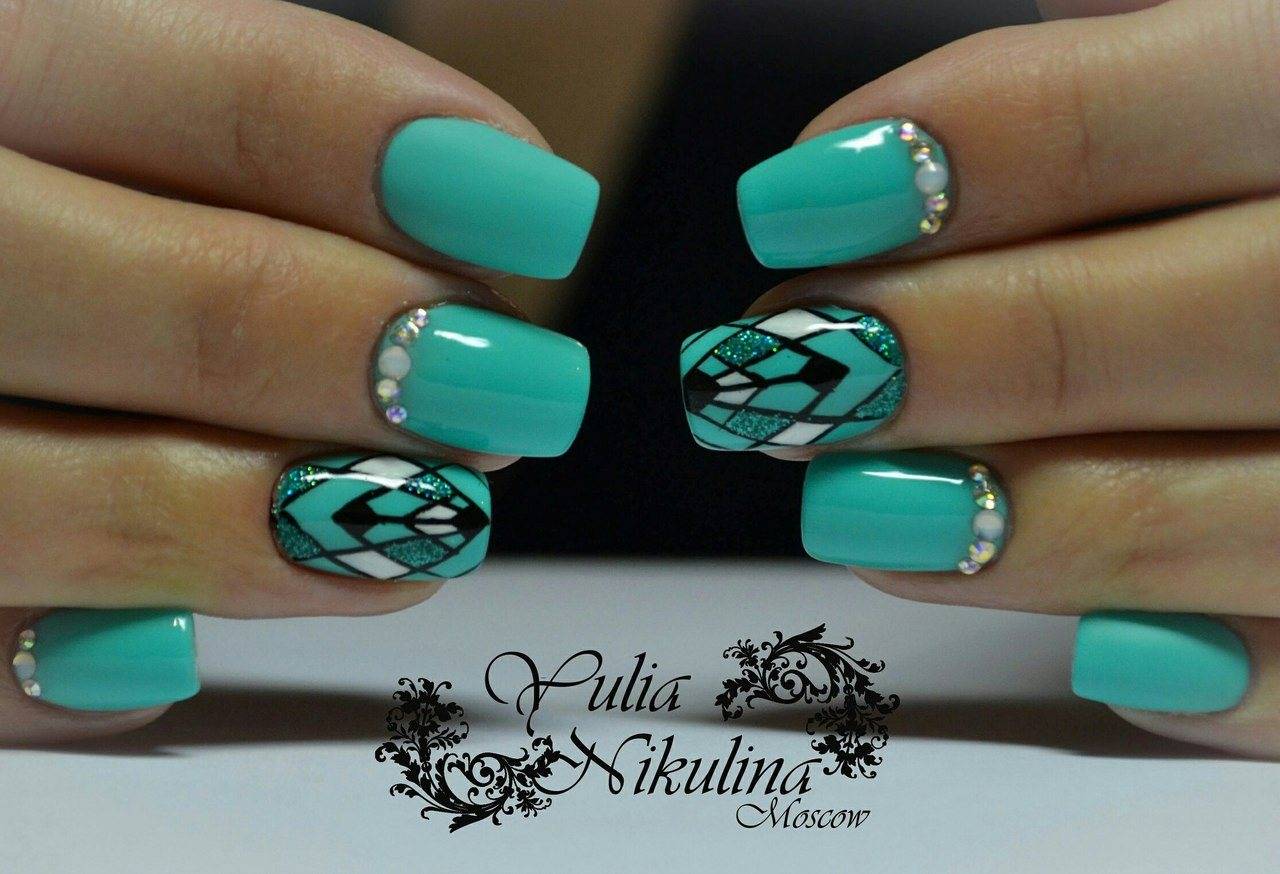 Трендовый маникюр в этом сезоне яркий. Можно сочетать матовые и блестящие тона, а так же разнополярные цвета, вовсе не родственные бирюзовому. Еще одна модная тенденция – геометрические узоры на бирюзовом фоне.