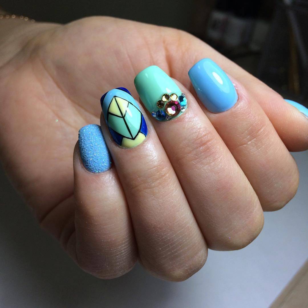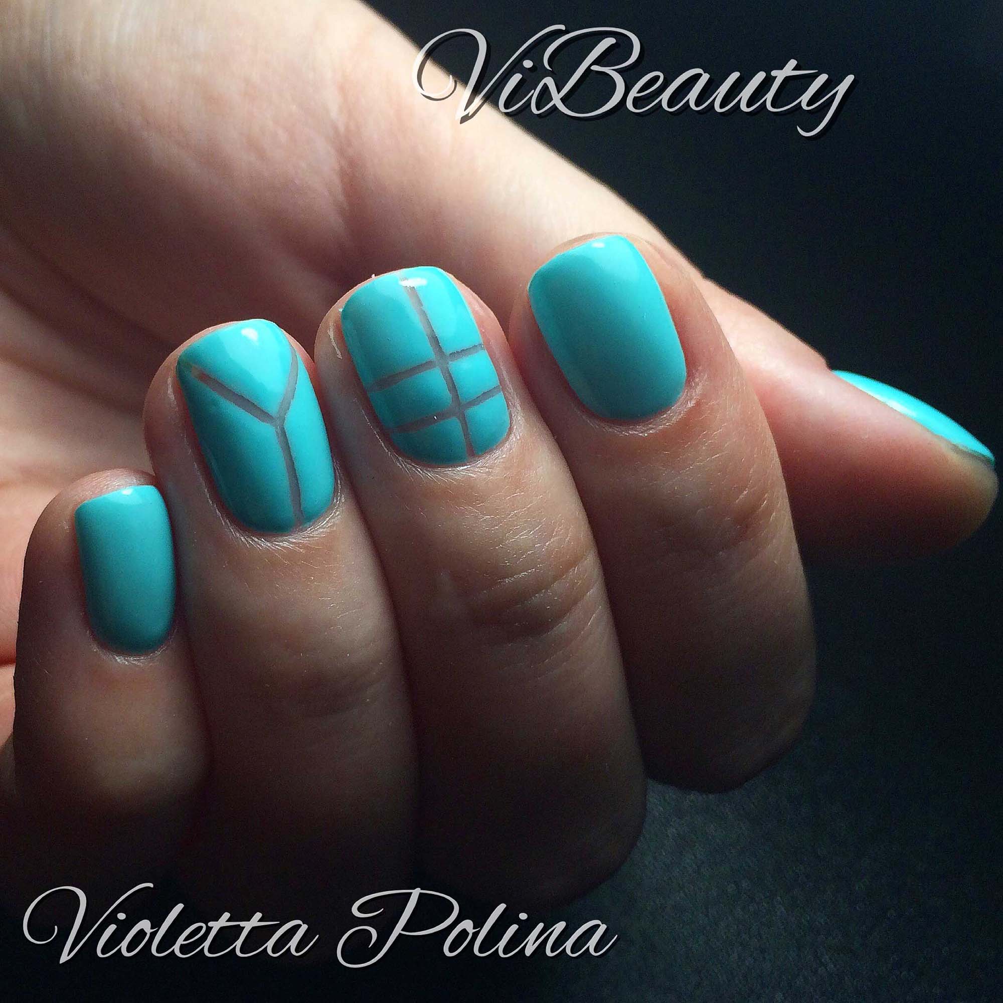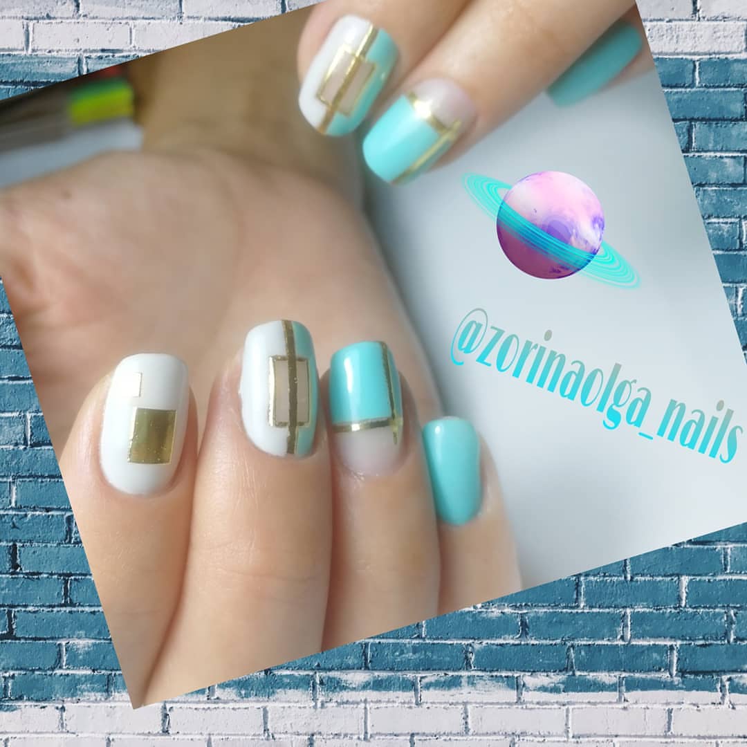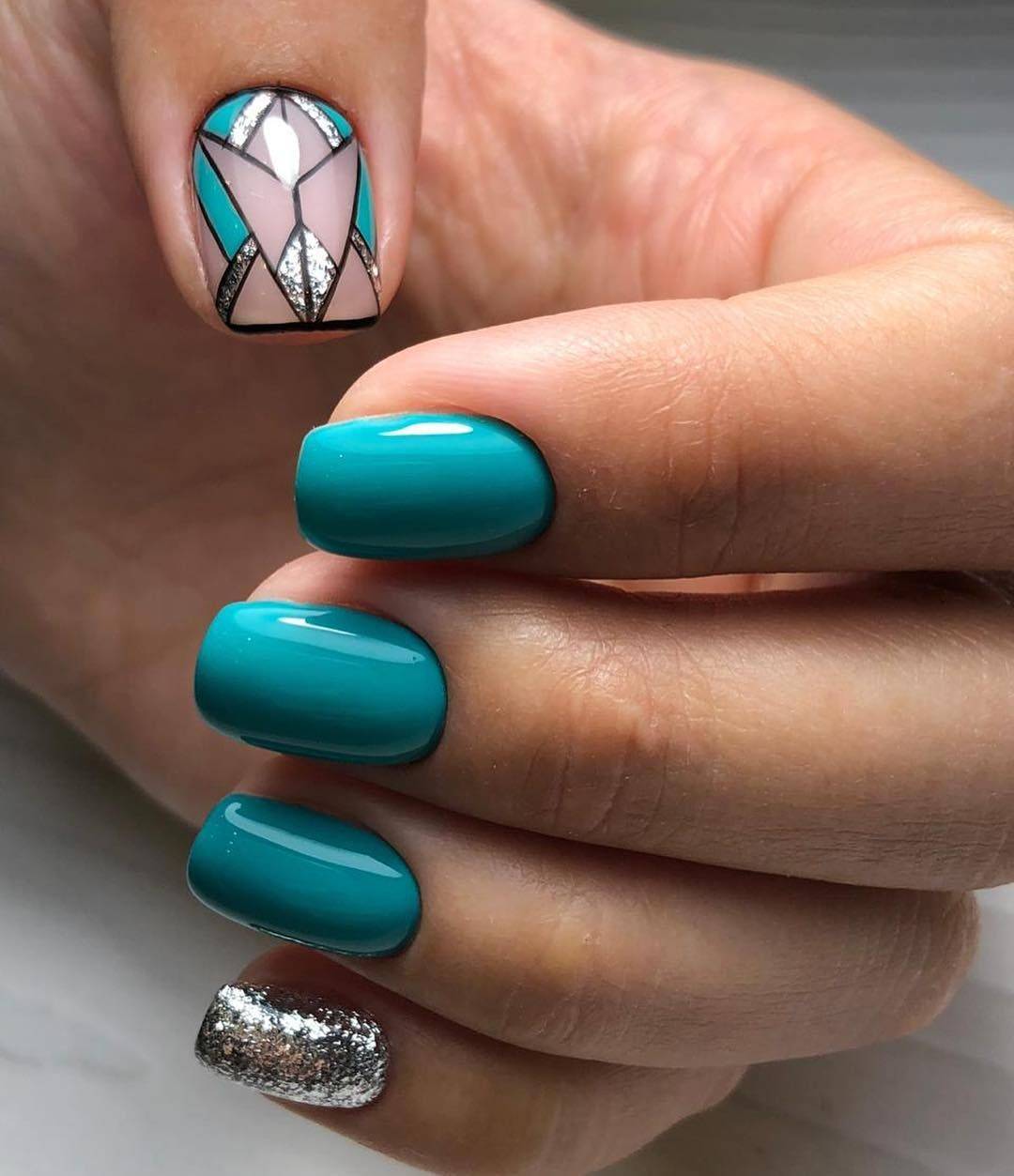 Геометрический маникюр в бирюзовом цвете на короткие ногти 2019