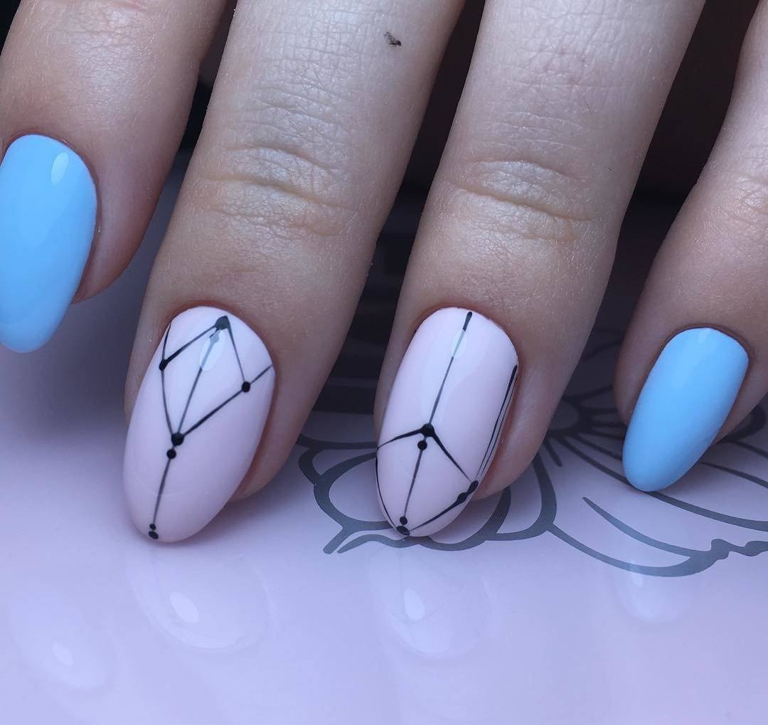 - Узор может быть абсолютно разным, это всегда смотрится интересно и непревзойденно. Достаточно даже просто нанести поверх небесного черные блестки.