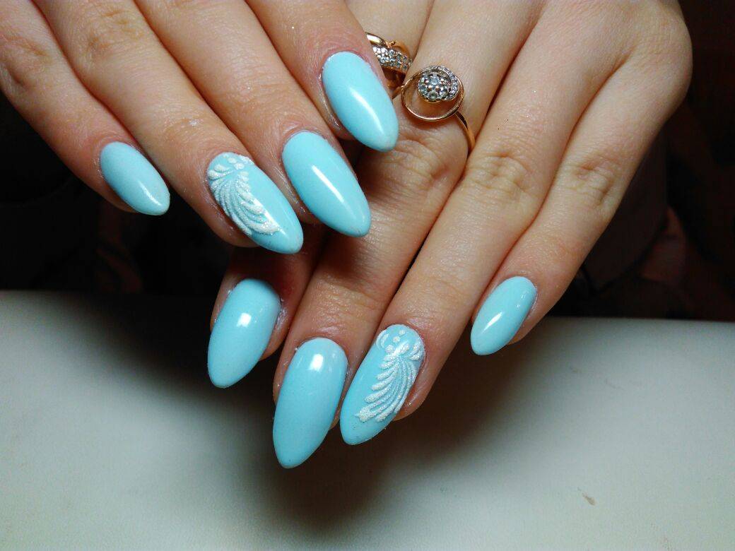 Это сделает маникюр более изящным. Ещё одна интересная дизайнерская идея – матовый финиш для такой длины. На основе такой модной новинки можно создать просто множество идей для маникюра. Экспериментируйте! Для любителей классики актуален френч или вариации лунного маникюра. Оригинальными стали рисунки или узоры на безымянном пальчике, инкрустация стразами, глиттером и просто однотонное покрытие в одном из многочисленных оттенков бирюзового.