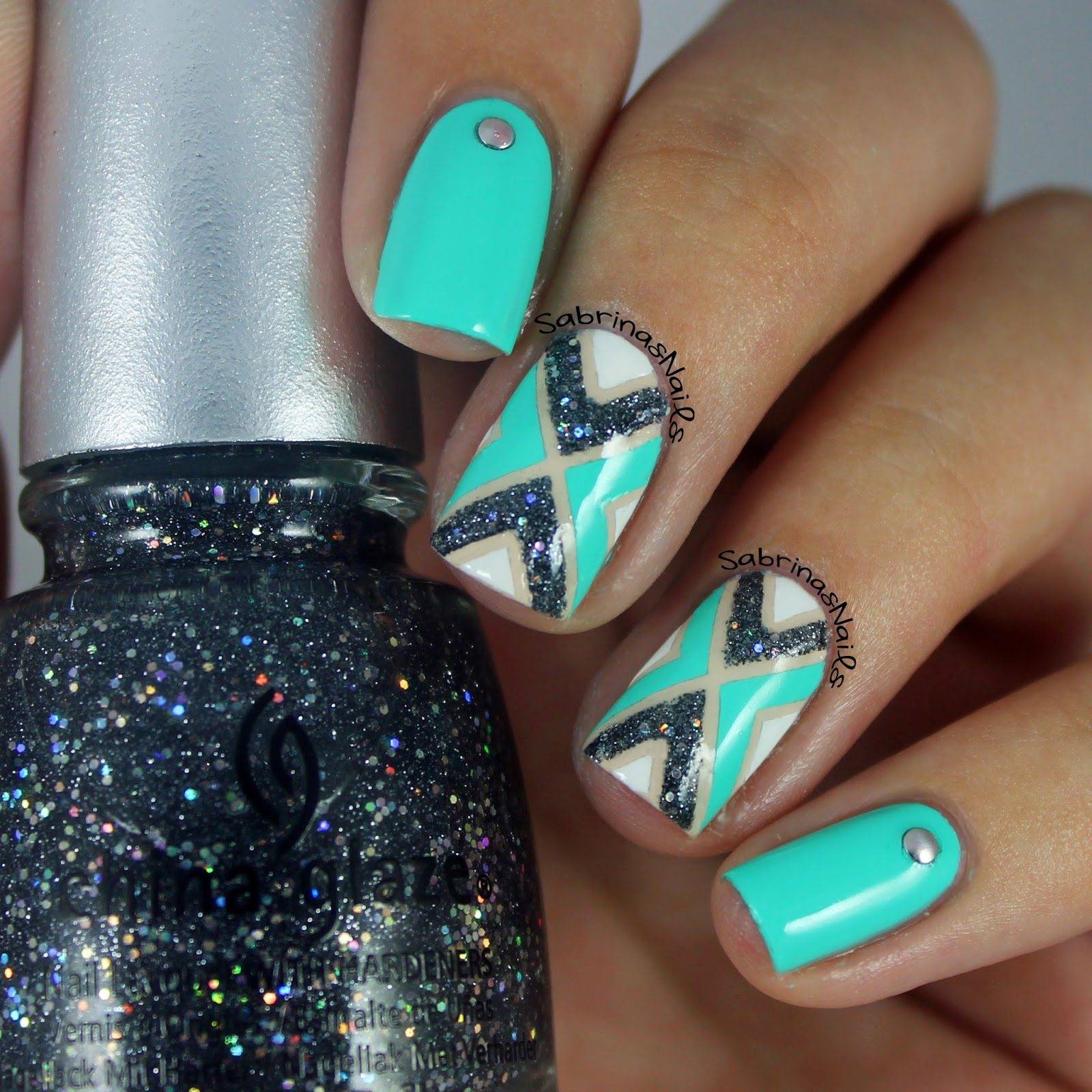 - Дизайн нейл-арта с ломанными бирюзовыми и коричневыми полосками хорошо дополнит бирюзовое платье с коричневым пояском. Такие полоски рисуются поверх ногтя, предварительно окрашенного в белый.