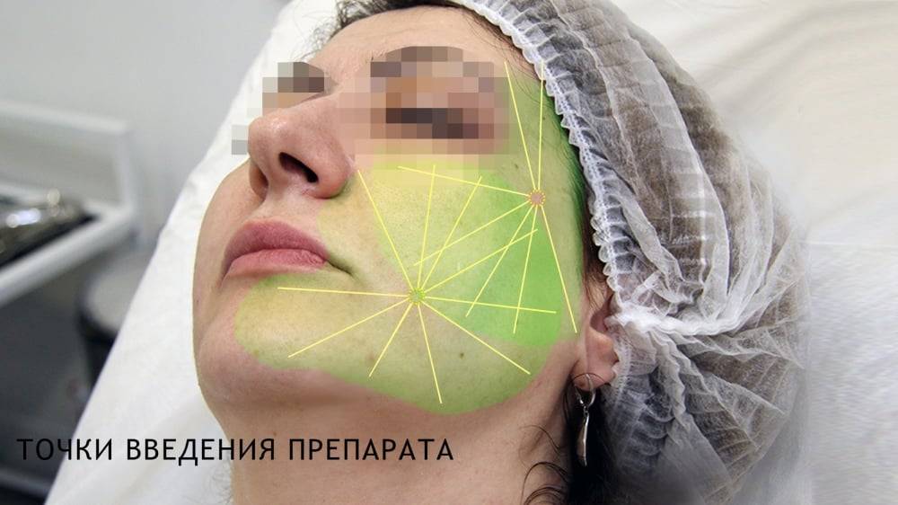 – инъекция препарата в гелевом виде- количество уколов и точки инъекций строго определены;