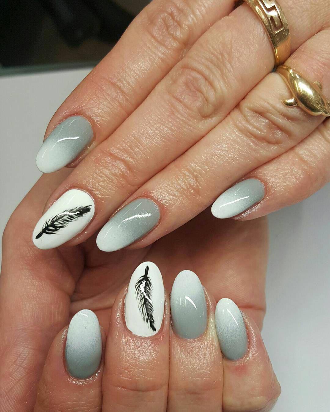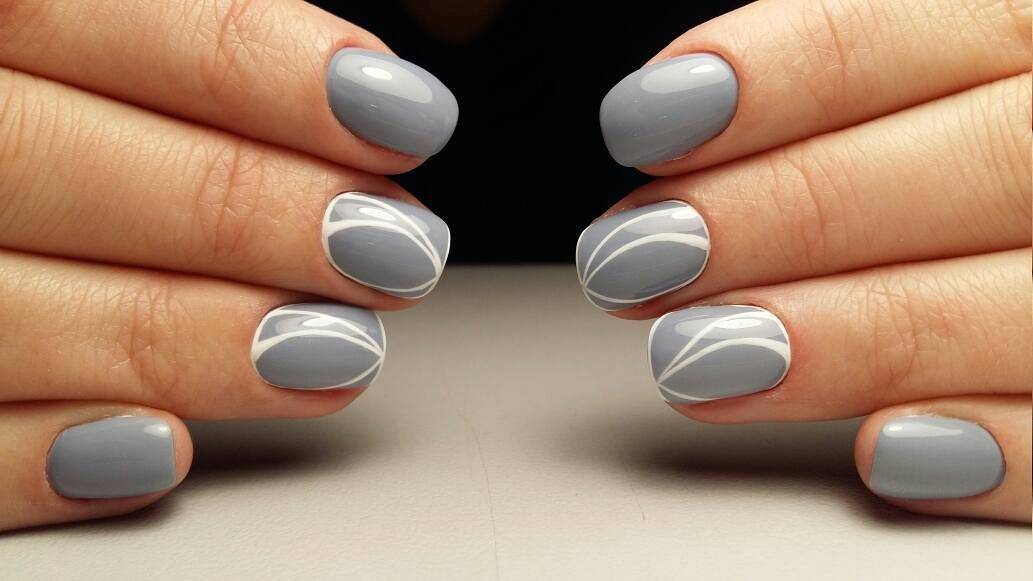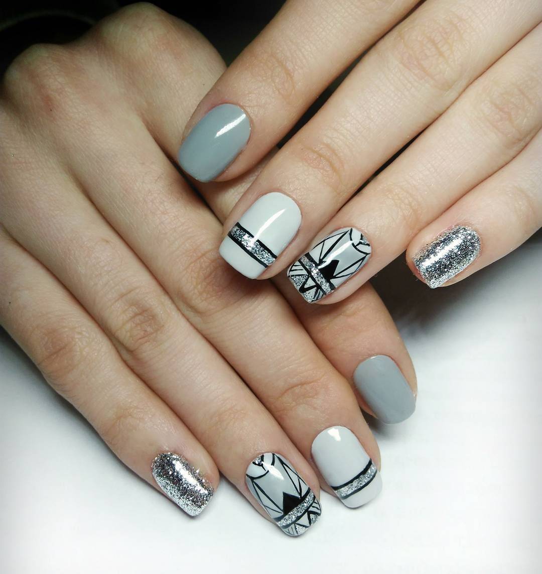 Самым популярным дизайном маникюра в осенний и зимний период считается твид. Он имеет общее сходство с вязаным маникюром. Оба они великолепно сочетаются с серыми оттенками лакового покрытия. Для выполнения твидового маникюра берутся черные, серые и белые лаки. Сам узор не имеет сложностей. В его основу входят простые линии различных размеров, которые наносят на кончик ноготка.