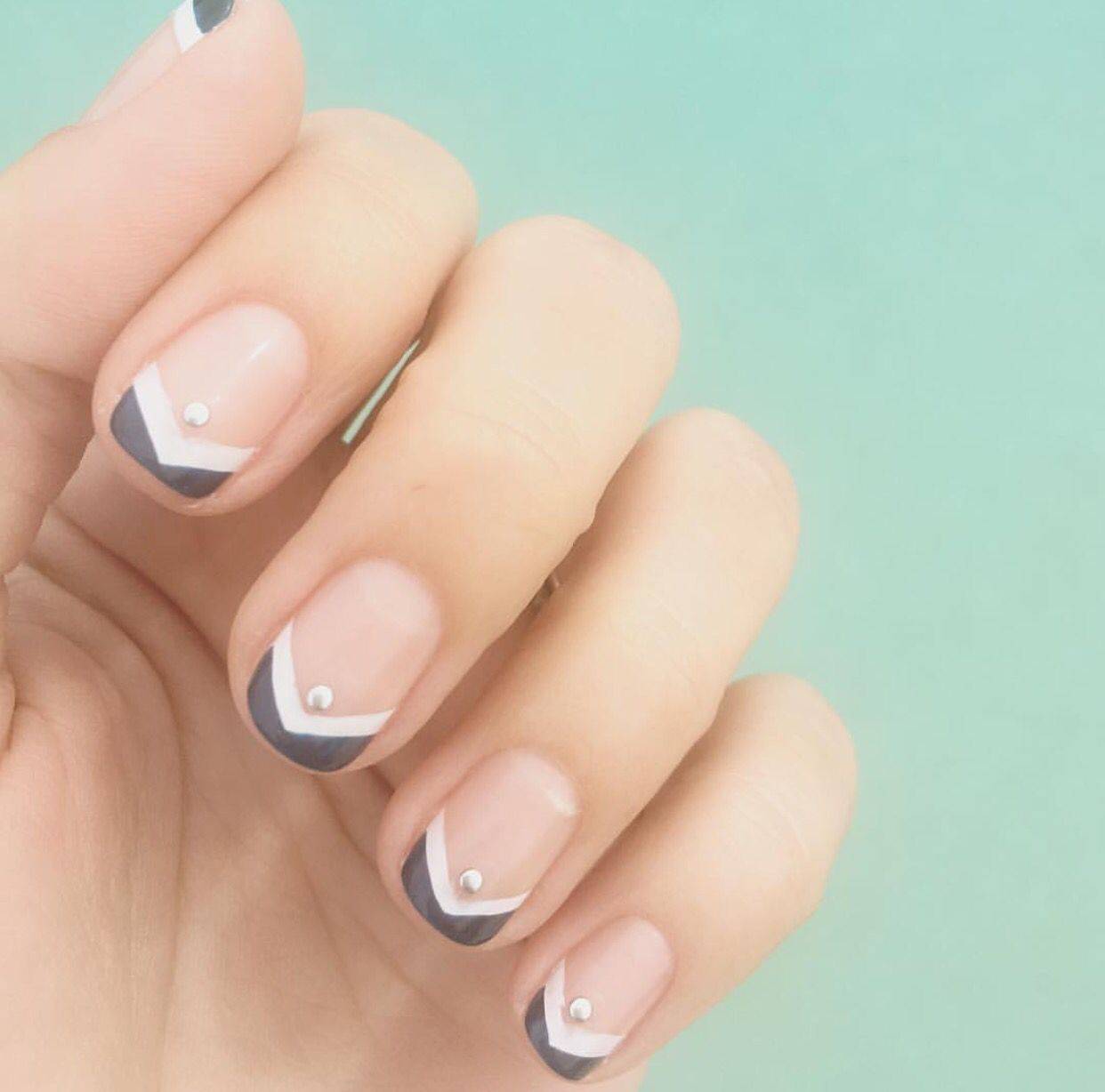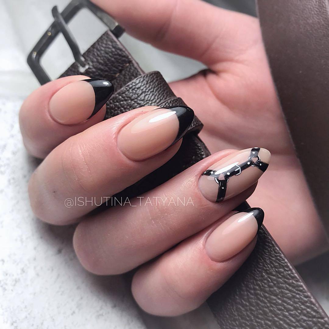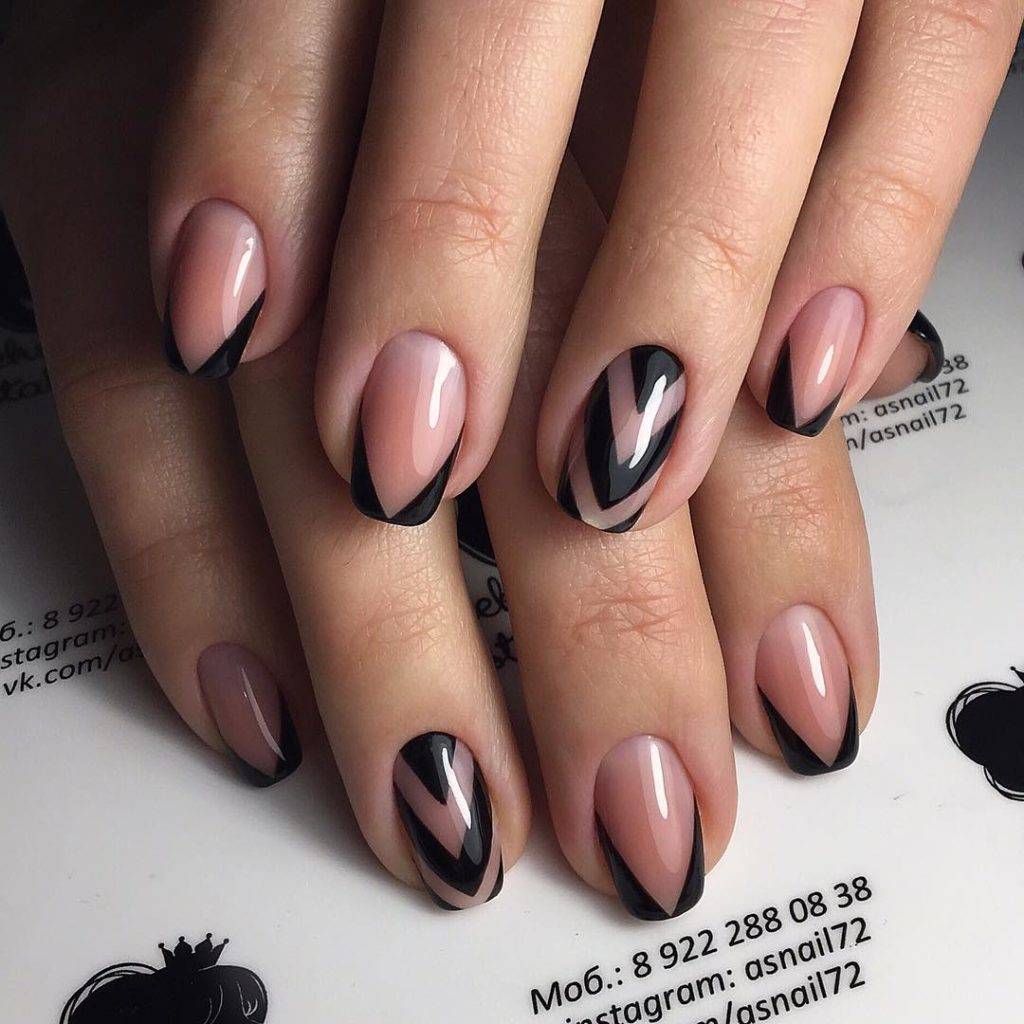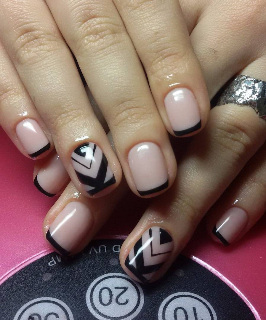 Черный и белый используются только для декора «улыбки» френча, остальное пространство ногтя покрывается прозрачным топом или светло-розовым цветом. «Улыбка» френча в черно-белом цвете отличается от классического варианта. Чтобы дизайн выглядел интересно, используйте двойную, смещенную, геометрическую форму «улыбки».