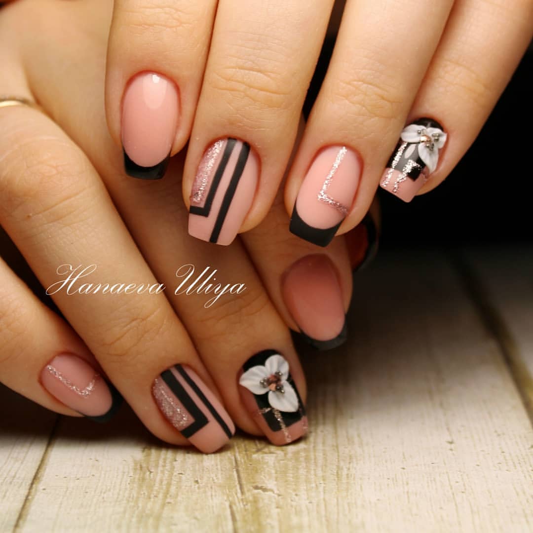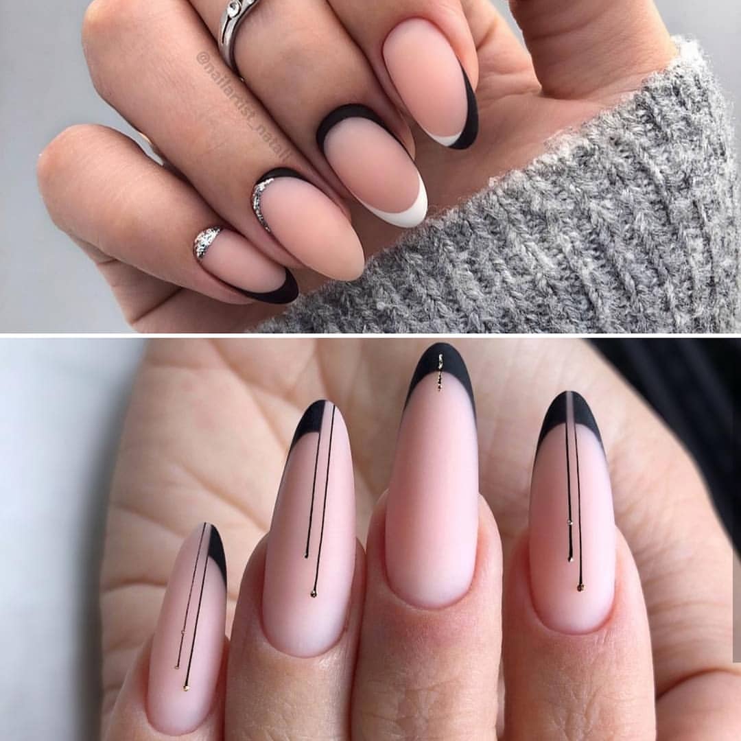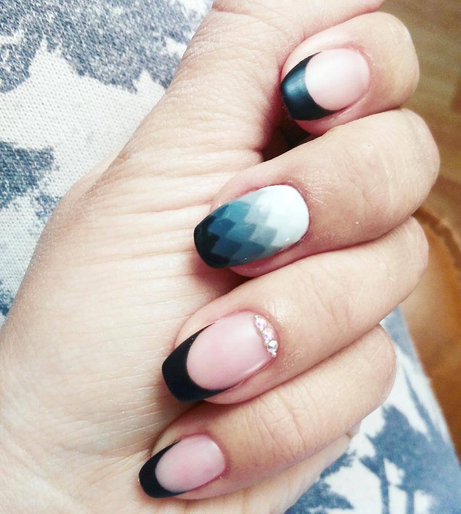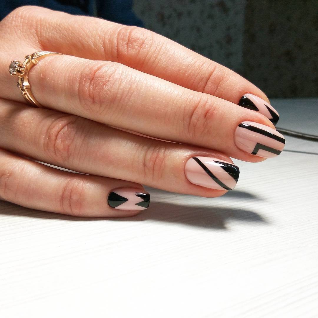 Черный и белый используются только для декора «улыбки» френча, остальное пространство ногтя покрывается прозрачным топом или светло-розовым цветом. «Улыбка» френча в черно-белом цвете отличается от классического варианта. Чтобы дизайн выглядел интересно, используйте двойную, смещенную, геометрическую форму «улыбки».