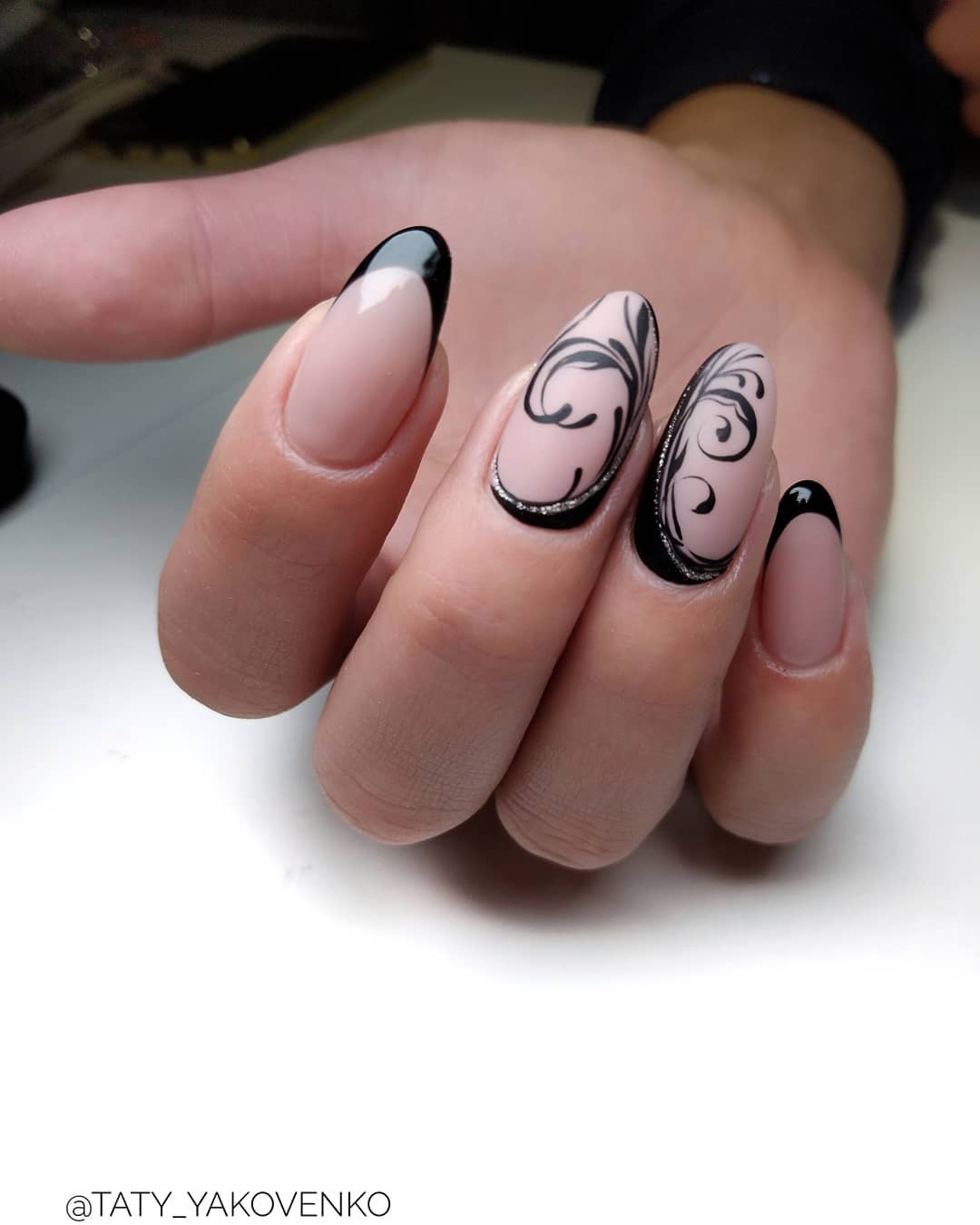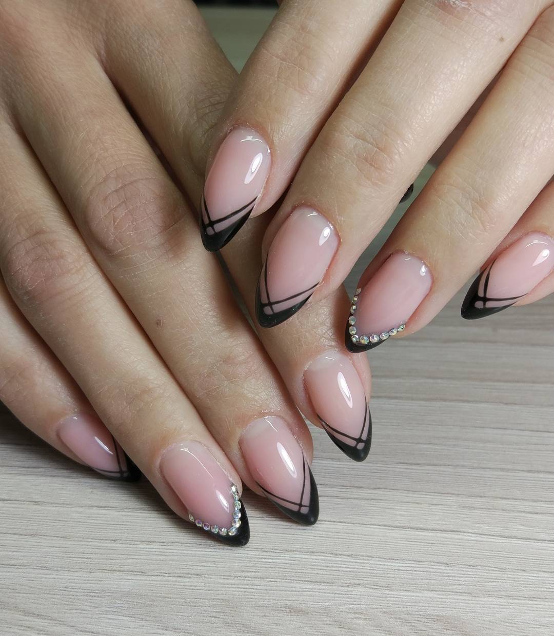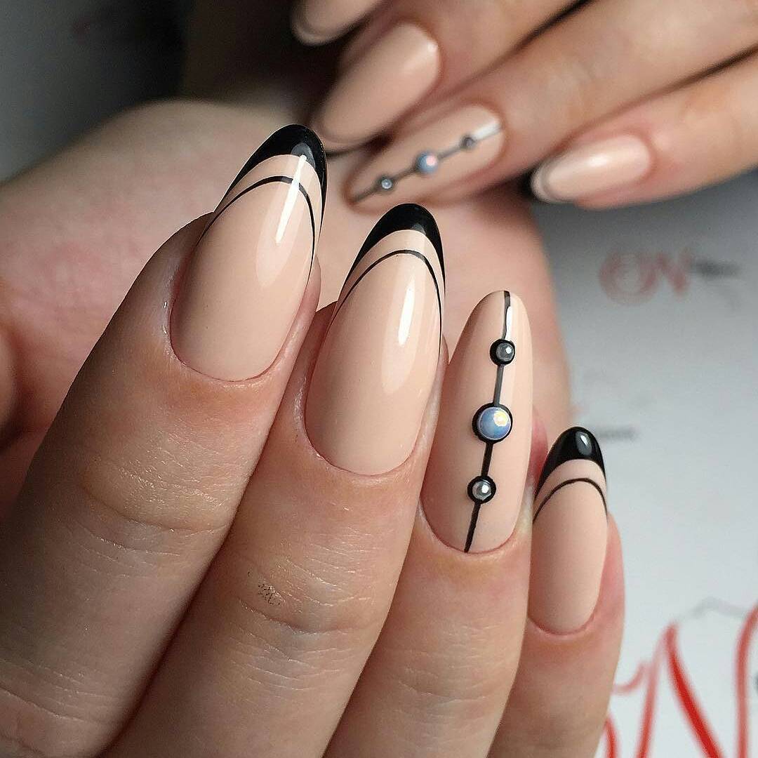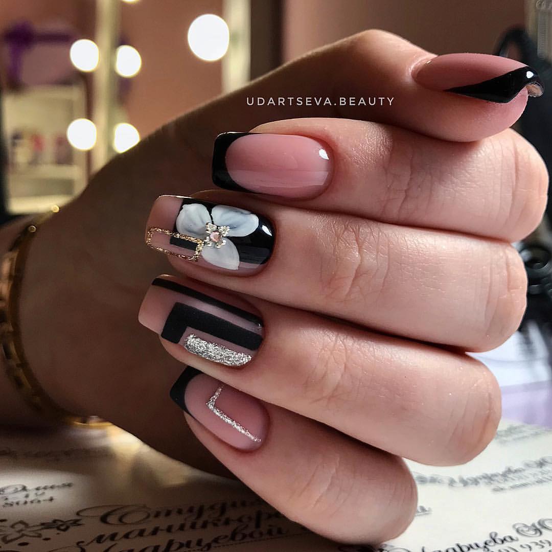 Черный и белый используются только для декора «улыбки» френча, остальное пространство ногтя покрывается прозрачным топом или светло-розовым цветом. «Улыбка» френча в черно-белом цвете отличается от классического варианта. Чтобы дизайн выглядел интересно, используйте двойную, смещенную, геометрическую форму «улыбки».