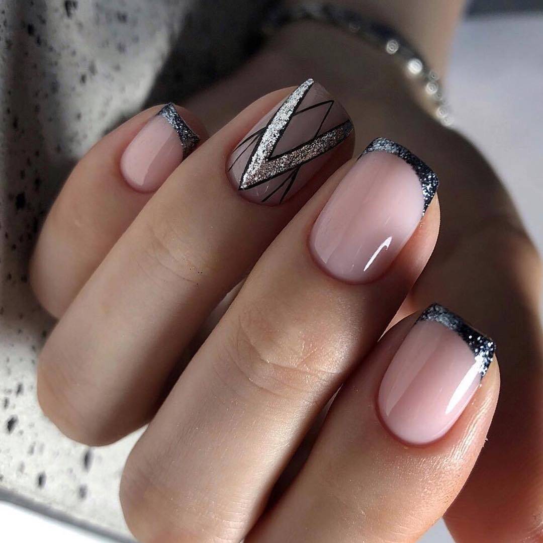 Часто блестками украшают кончик ногтевой пластины или базальную область, благодаря этому получается акцент в маникюре. В основном это делается только на нескольких ногтях. Этот вариант отлично подойдет для любого случая, потому что он не слишком яркий и выглядит нежно. Также многие мастера по маникюру используют блестки только в качестве акцента, а именно украшают рисунки. То есть изначально французский маникюр сочетается с монограммами, геометрическим рисунком, кружевными вставками, когда все готово, дизайн можно подчеркнуть блестками. В результате получается роскошный объемный маникюр с мерцающими деталями. Он подходит для любого случая, поэтому в 2020-2021 году он особенно актуален.
