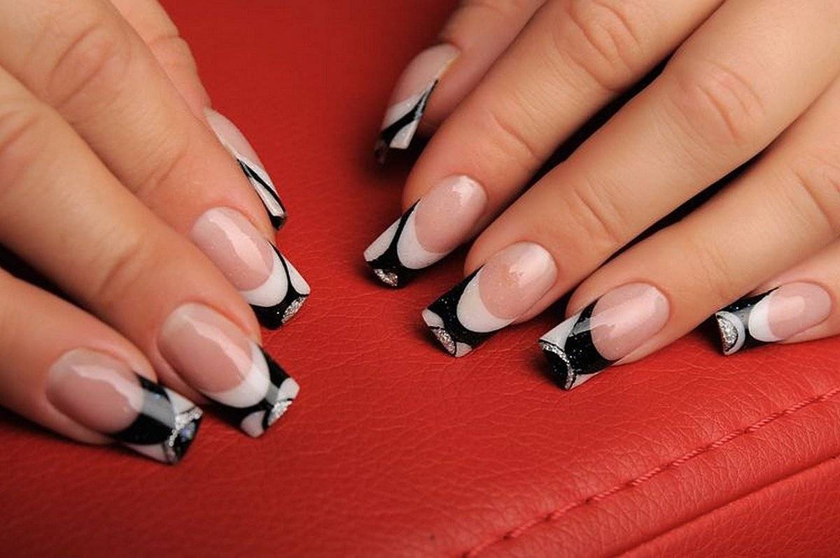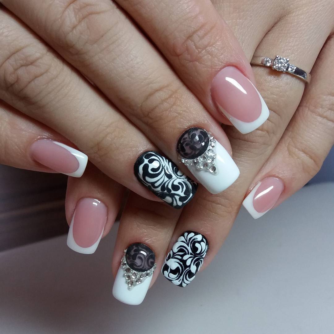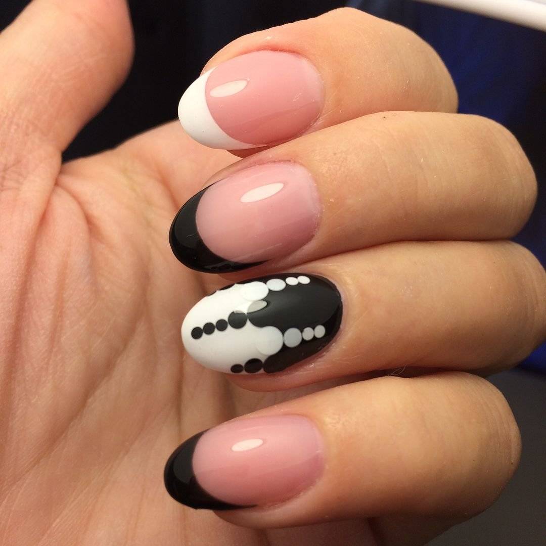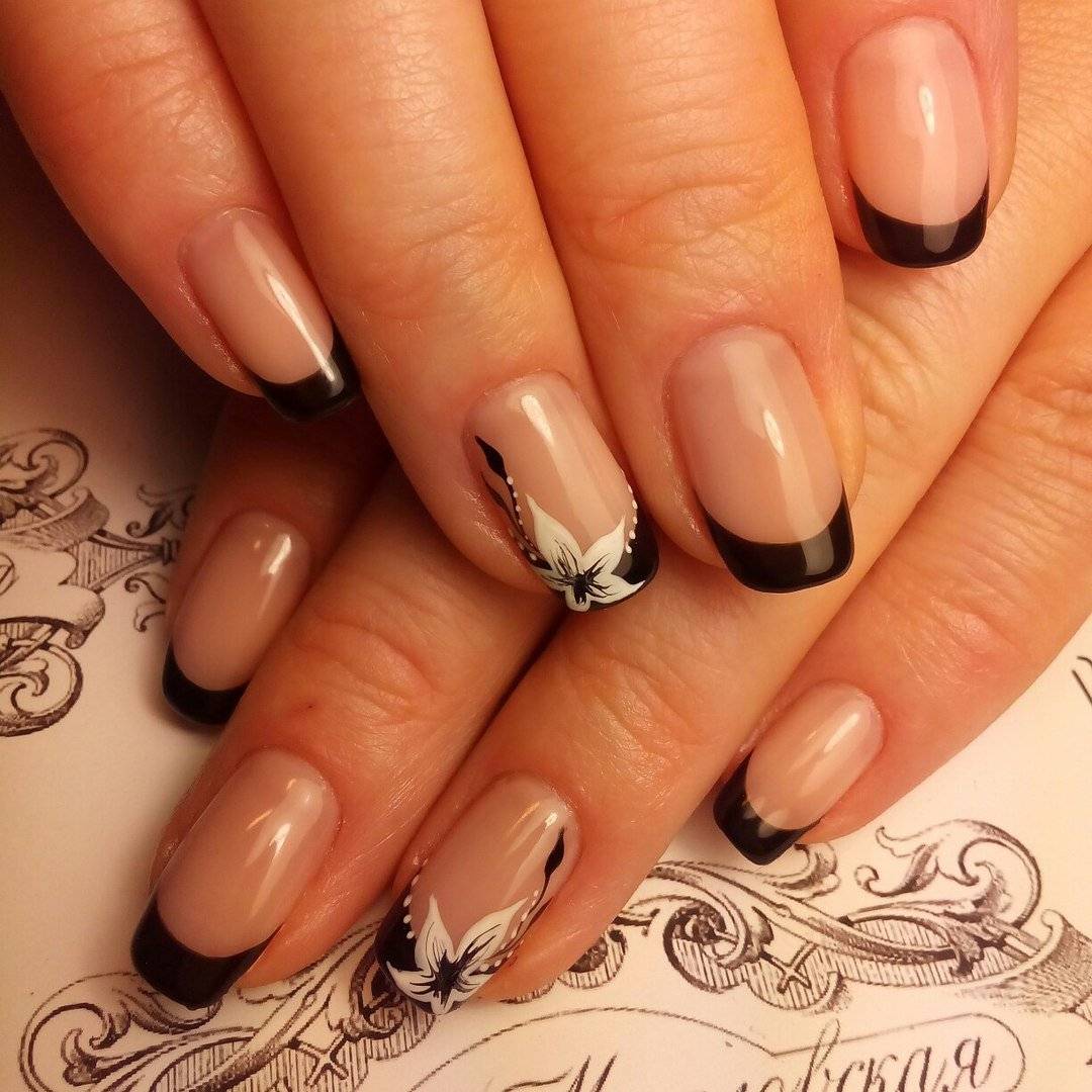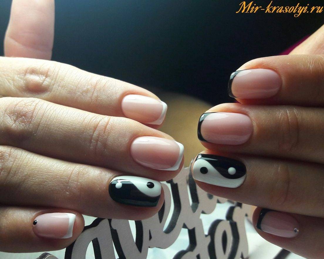 Не исключены и классические варианты френча в черно-белом цвете, когда черным покрывается вся ногтевая пластина, а белым прорисовывается линия «улыбки».