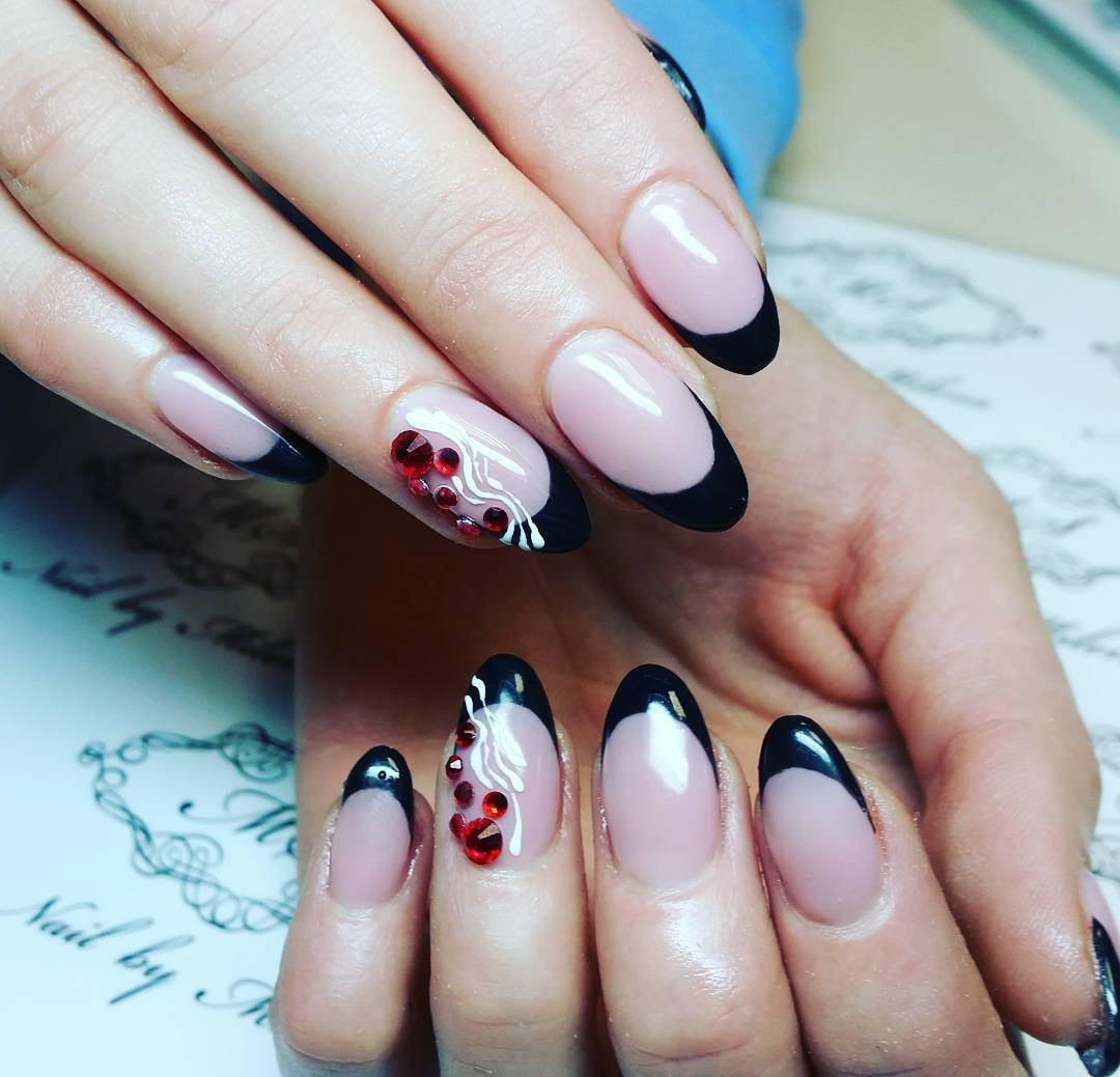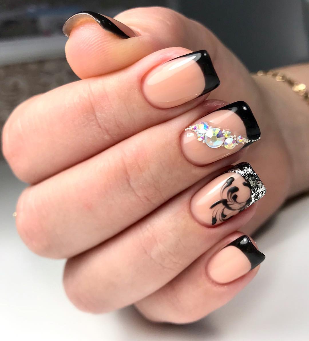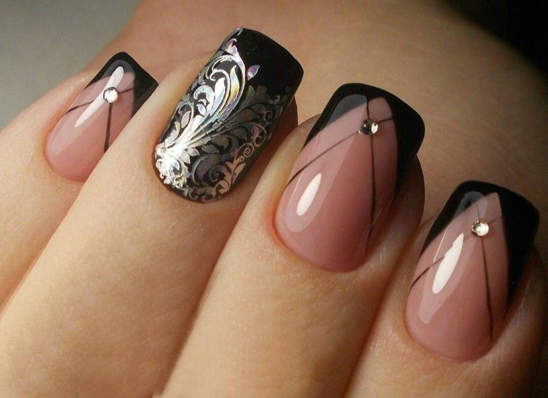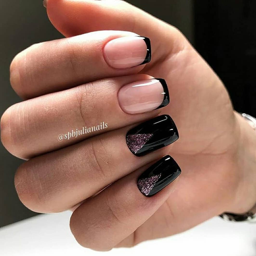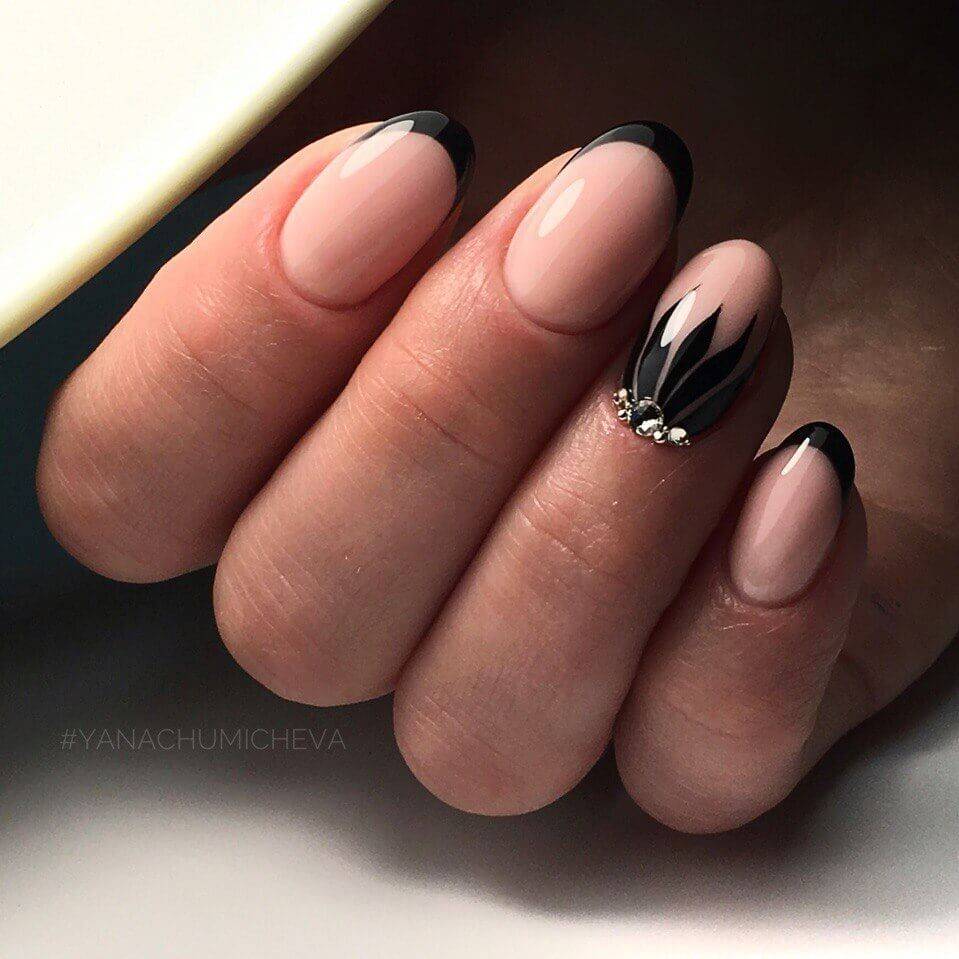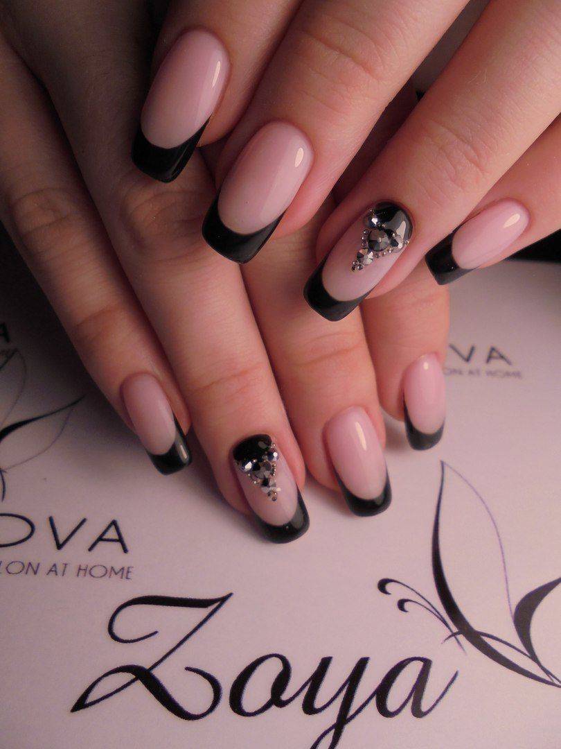 Черный френч выглядит привлекательно и в классическом исполнении, но если дополнить маникюр стразами, фольгой, глиттером и другим декором, то дизайн получится невероятно стильным и броским.