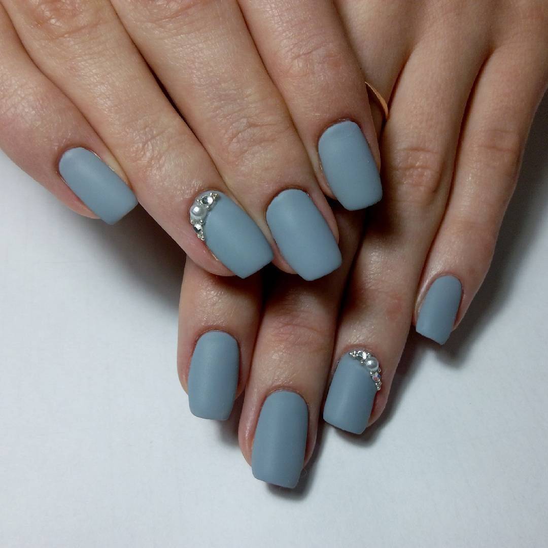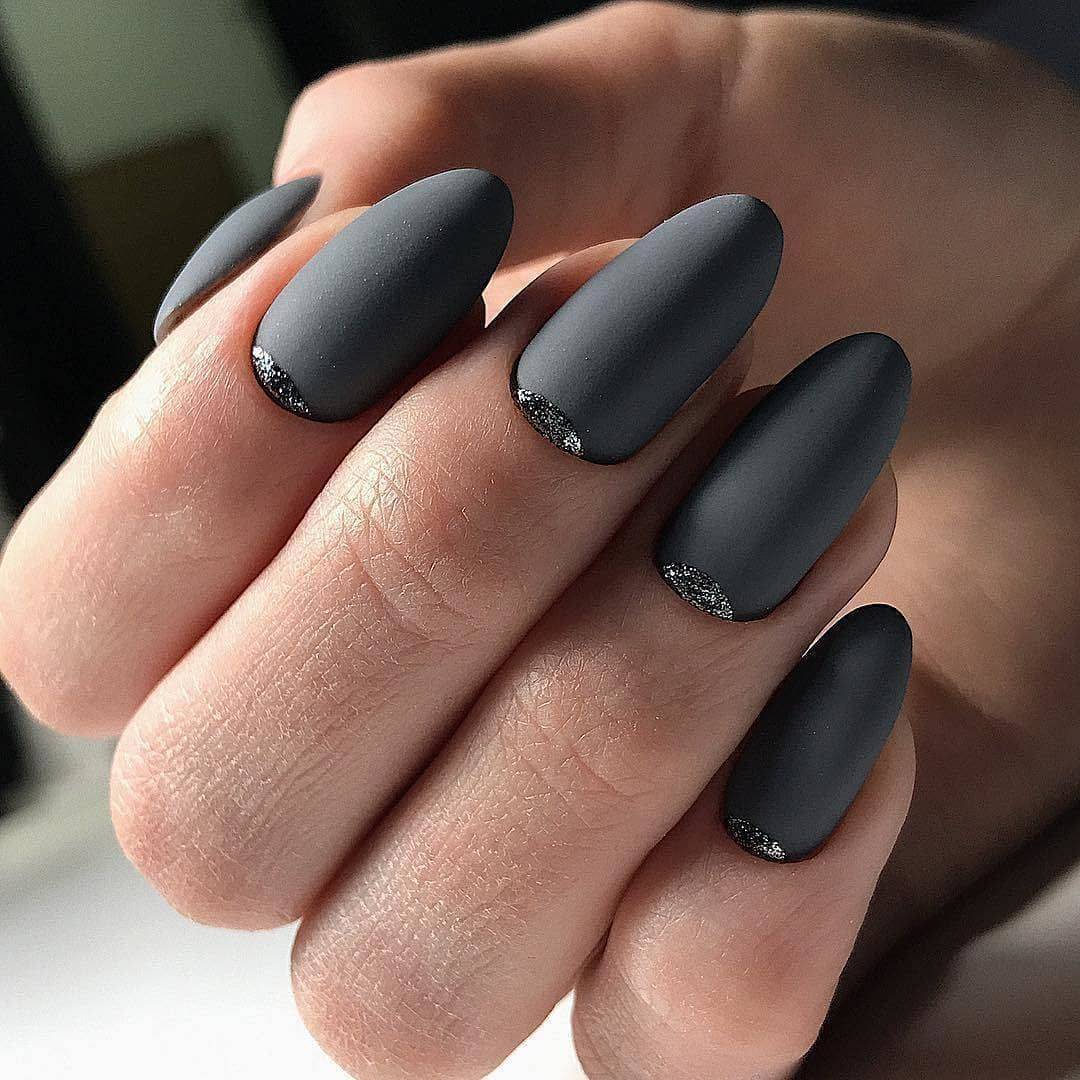 В 2019 году одним из горячих трендов beauty-индустрии считают матовый черный маникюр. Он уже который год радует поклонниц матовых тонов своим разнообразием. Модный матовый маникюр в черном цвете — универсален. Он неброский, не вызывающий и подходит даже для похода на работу. Матовый черный лак отлично дружит с блестками различных тонов и фольгой металлического цвета. Данный маникюр выглядит безупречно на коротеньких ноготках миндальной или овальной формы. Более элегантно и даже немного провокационно смотрится черное матовое покрытия на острых, длинных ногтях. Матовый цвет сам по себе выглядит нежно и скромно, но если вам все же хочется разнообразить монотонность, фантазируйте с дизайном, добавляя разные материалы декора.
