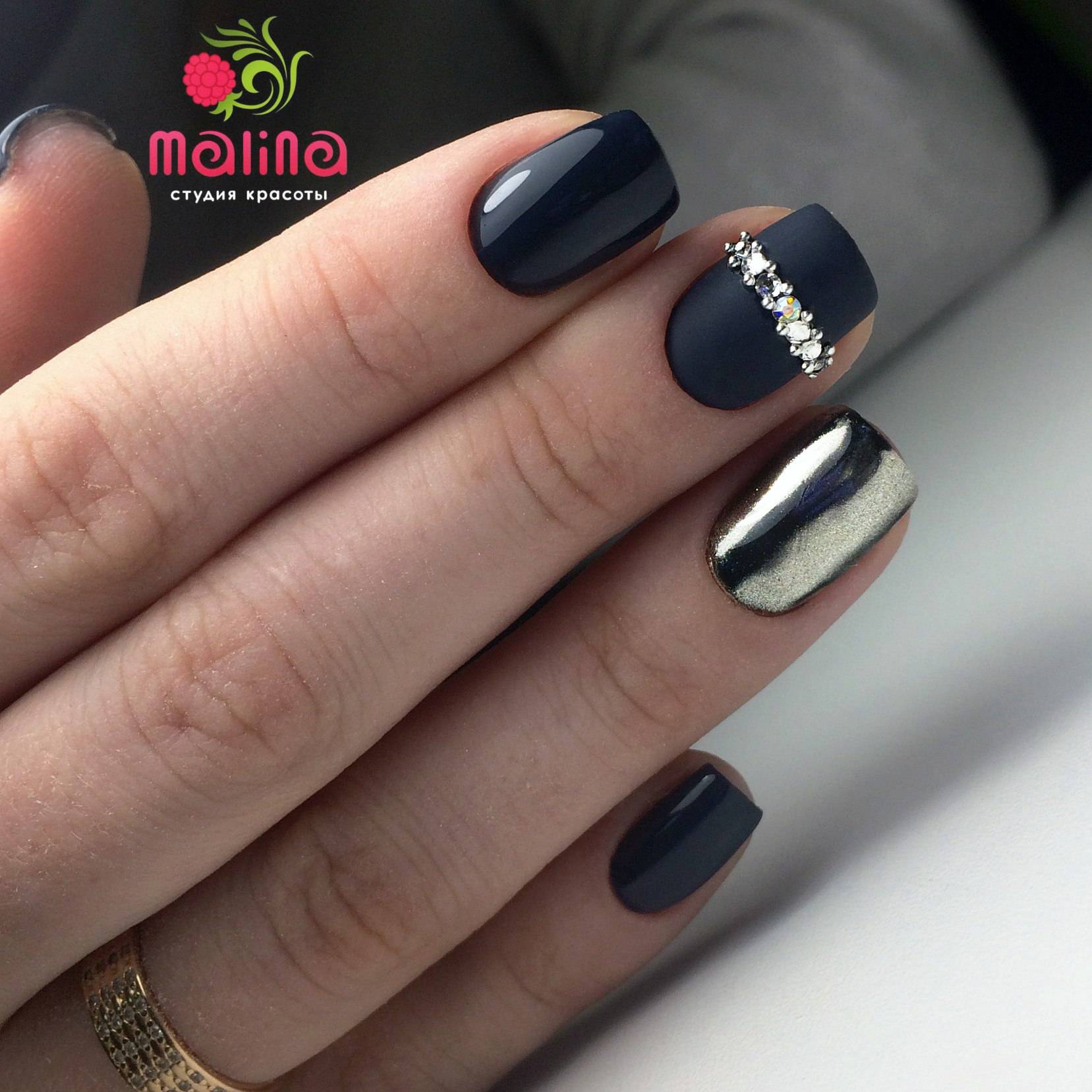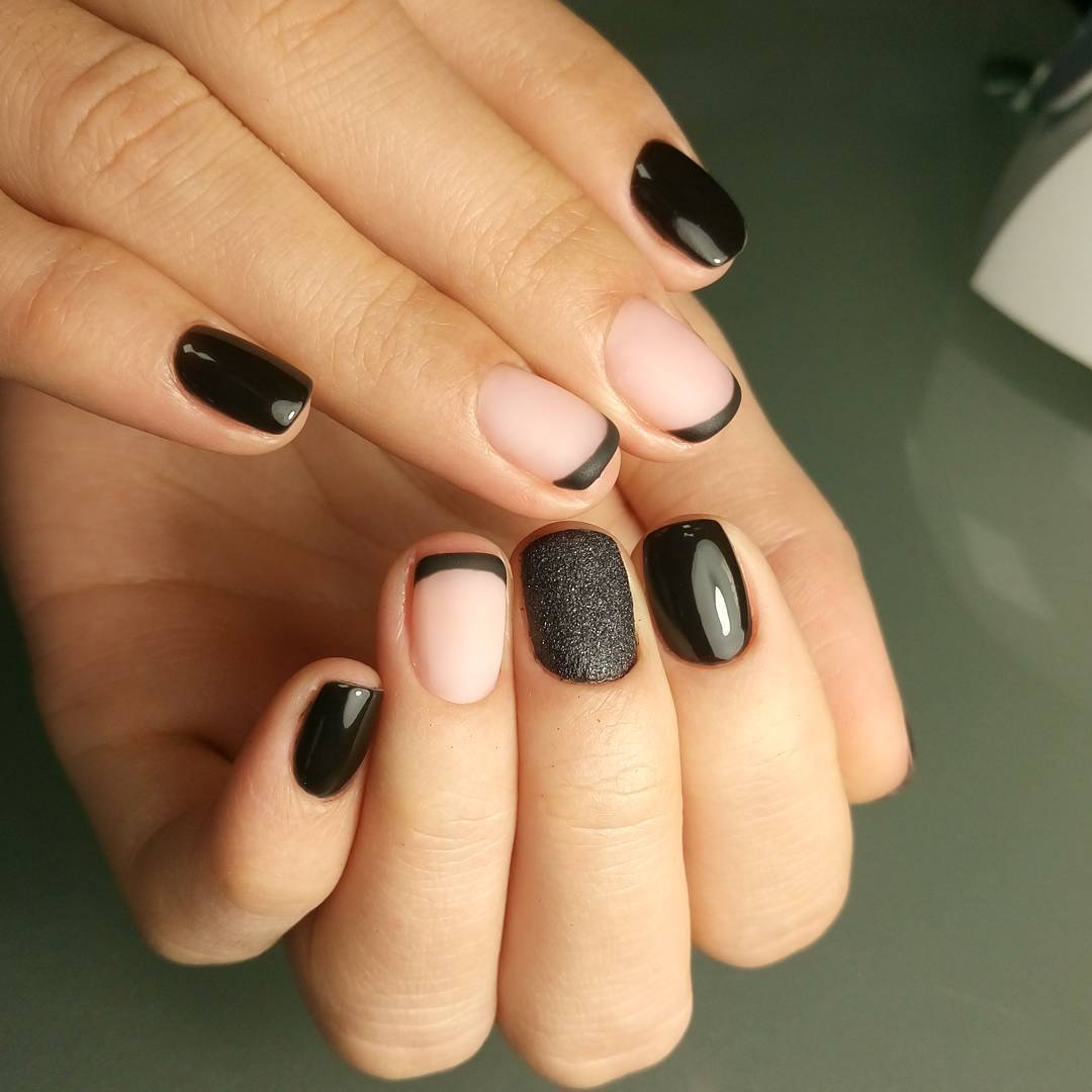 - сочетание черного матового и глянцевого гель-лака – используйте насыщенный, почти угольный оттенок черного. Кроме того такое сочетание позволяет создать объемные нейл-арты.
