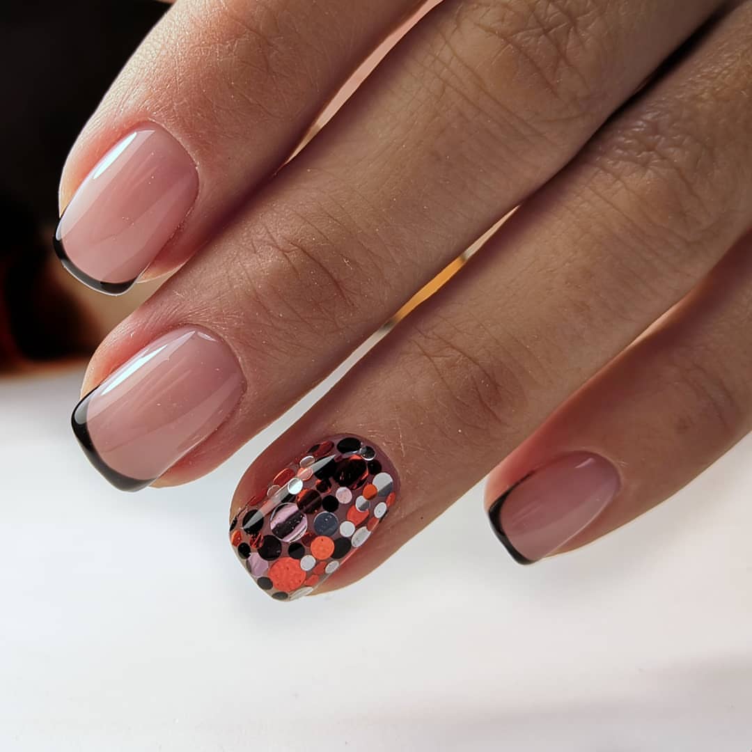 Очень стильно смотрится френч с блестками на коротких ноготках, в любых цветовых решениях.