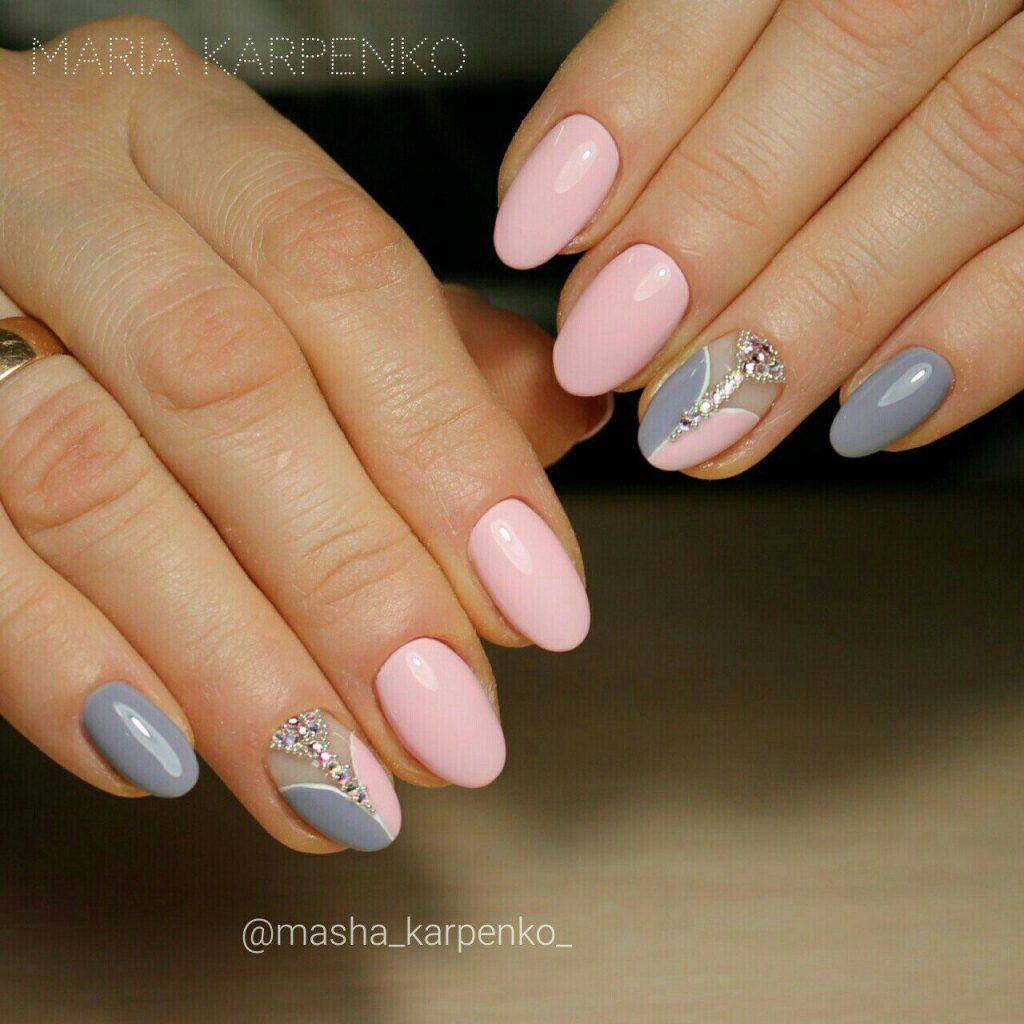Чтобы получить стильный дизайн, на овальные ногти можно сделать лунный нейл-арт с матовым финишем. Лунку оставьте «голой» или заполните глиттером. В сочетании с матовой поверхностью блестящие островки выглядят особенно интересно. Самые популярные оттенки: светло-серый, пудровый, нюдовый, сиреневый.