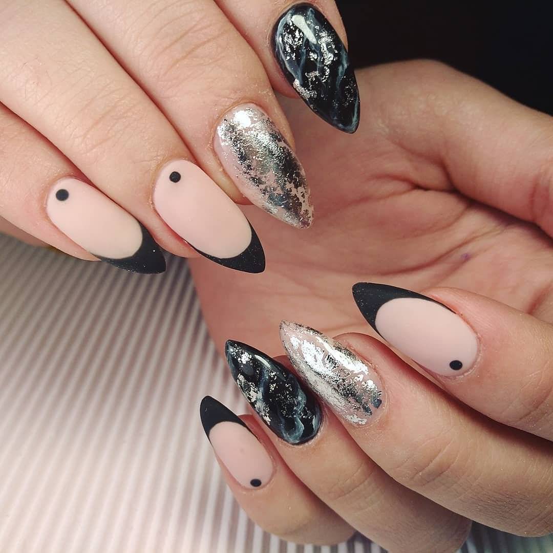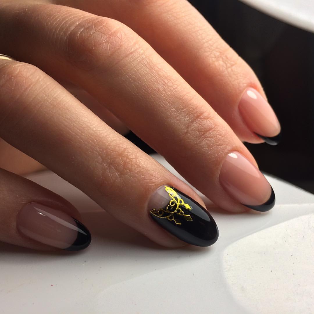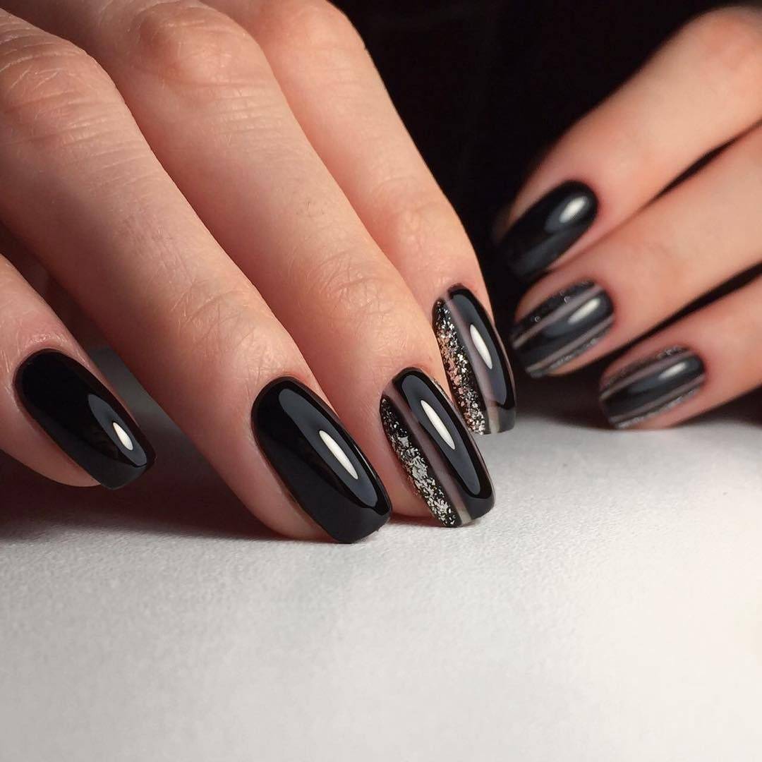 Лучше всего черный маникюр смотрится с золотом. Так ваши ноготки выглядят роскошно и богато, и точно не останутся без внимания мужчин. Черный цвет можно украсить с помощью мелких или крупных блесток. Прекрасное решение — полностью покрыть золотыми блестками определенные ноготки. А можно пройтись по линии кутикулы. Штамповка для ногтей (стемпинг) золотыми принтами в стиле барокко, узорами в виде цветов и сложных геометрических фигур смотрится изящно. Тоненькие золотые полоски, фигурки и узоры различного вида на фоне черного лака — это превосходно, лаконично и модно. Для оригинальных и смелых девушек отлично подойдет сочетание черного с мраморным оттенком и добавлением фольги золотого цвета.