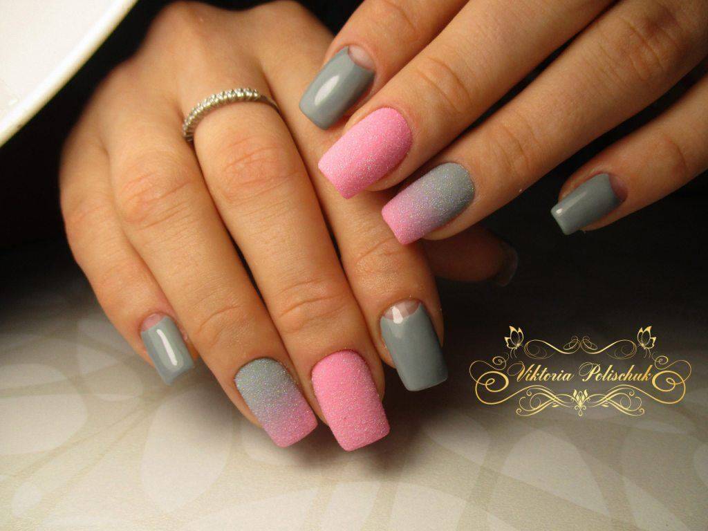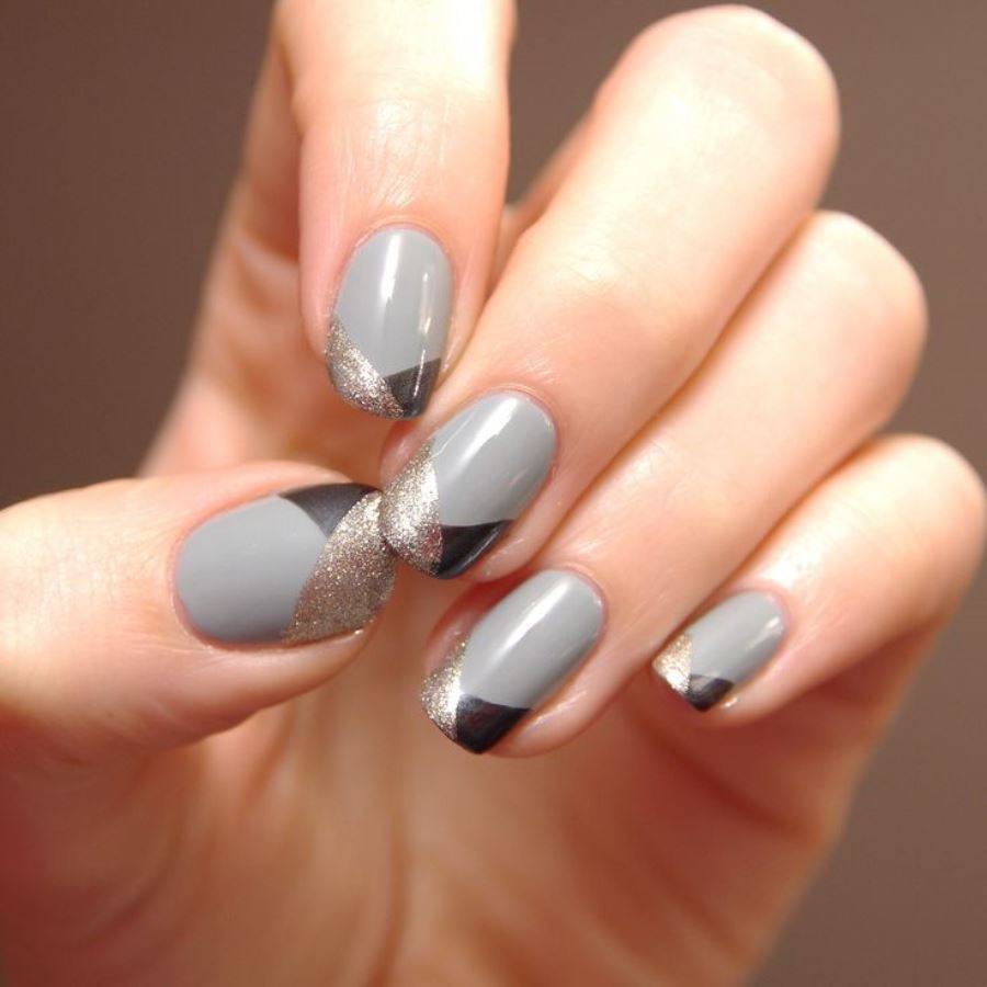 Это удивительный вид дизайна французского маникюра. Он необычен тем, что на смену полуовалу приходит прямой угол. Довольно оригинальный и стильный дизайн, который может выполняться как в одном цвете, так и в двух сразу. То есть одна половина ноготка покрыта серым оттенком лакового покрытия, а другая белым или вообще черным цветом. Это придаст дамским ноготкам необыкновенно элегантный вид. В качестве дополнительных элементов для декора можно использовать фольгу, стразы, камифубуки или бульонки. Некоторые мастера маникюра предлагают украсить данный вид дизайна нежной и утонченной лепкой.