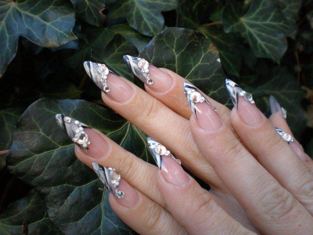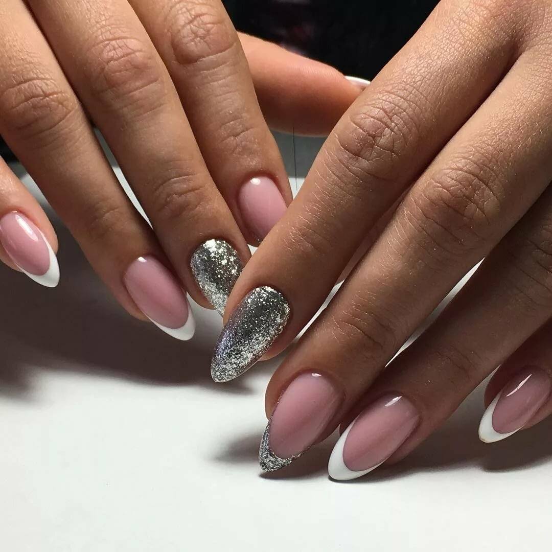 Очень современно и оригинально будет выглядеть блестящий французский маникюр на длинных острых ноготках или на ноготках формы балерина.