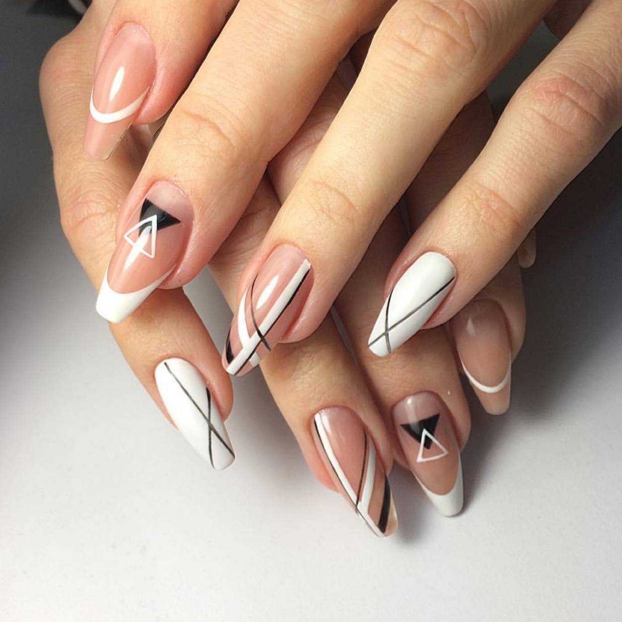 Ниже на фото новинка маникюра: линия улыбки перетекает в линейный рисунок. Эта интересная техника придется по душе любительницам геометрии и минимализма. Рисунок и линия улыбки должны быть выполнены одним цветом. Чаще всего используется белый или черный.