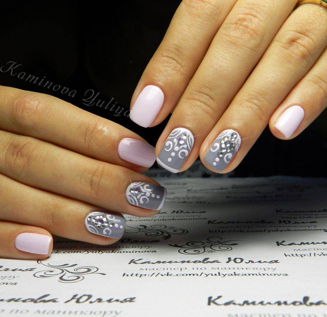 Если вы хотите получить нежный и приятный глазу дизайн ногтей, то используйте в маникюре только белый цвет совместно с блестящим декором. Для тех девушек, которые не прочь поэкспериментировать с оттенками, можем предложить черно-белые нейл-арты, дизайн с бордовым или светло-синим оттенками.