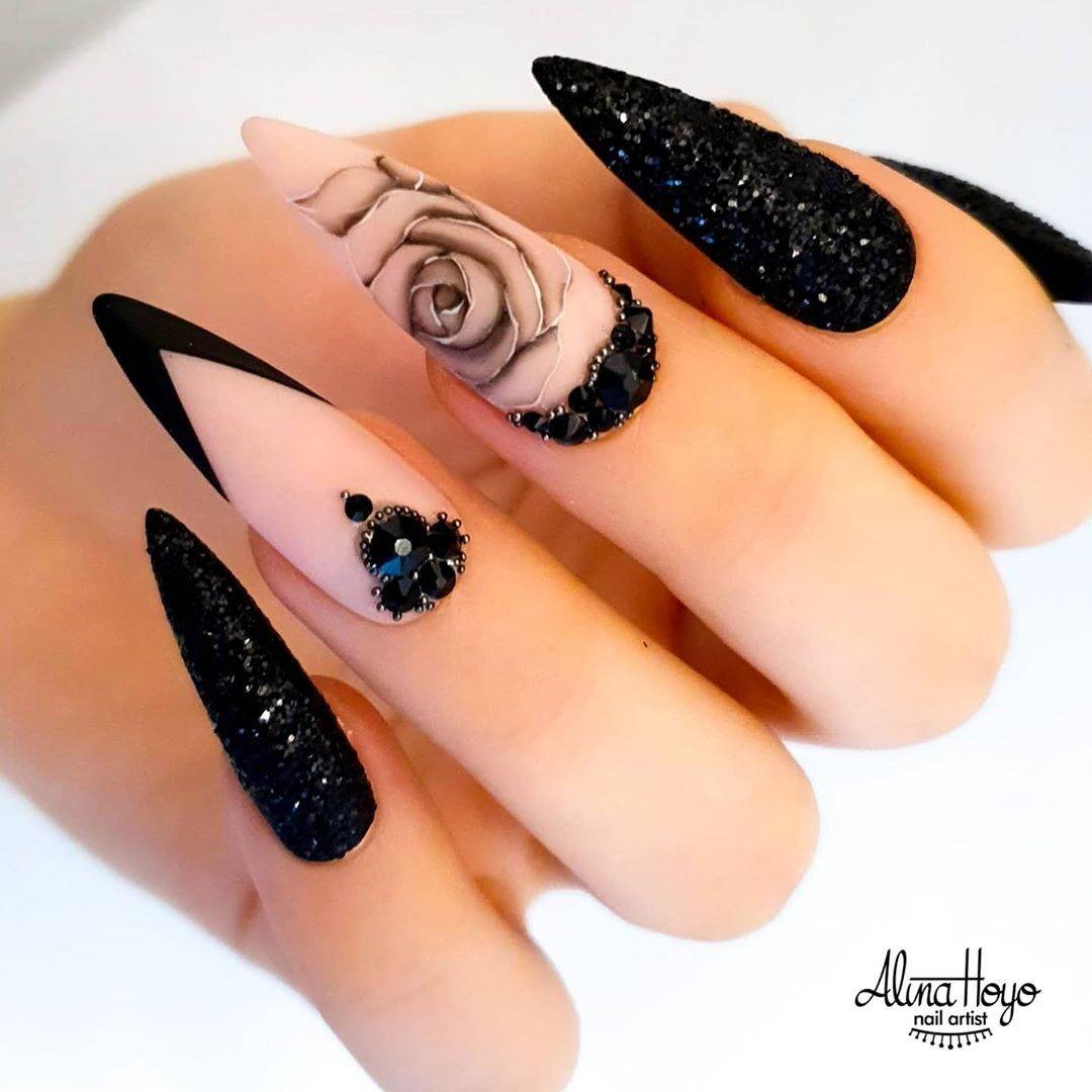 Манеры исполнения черного маникюра с цветами