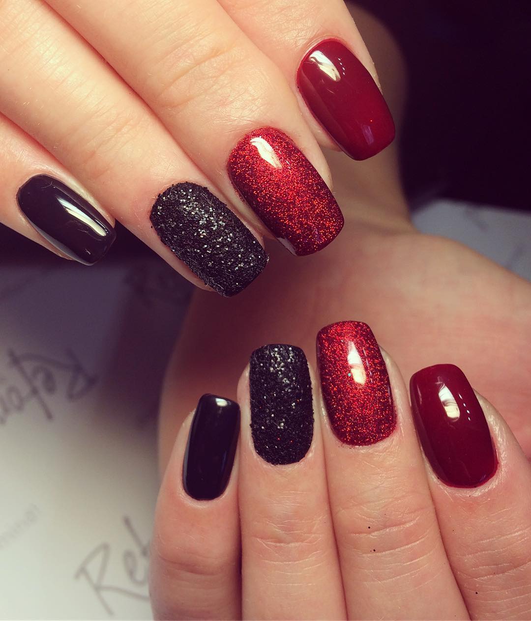 Среди мастеров нейл-дизайна сочетание красного и черного цвета в маникюре считается одним из идеальных, который подойдет женщинам и девушкам любого возраста. Скомбинировать маникюр в красно-черном цвете можно двумя способами. Первый — это графическая разметка ногтя, то есть поверх красного лака наклеивается трафарет с различными узорами и ноготь покрывают лаком черного цвета. После удаления трафарета, на ногтях образовываются различные узоры и рисунки.
