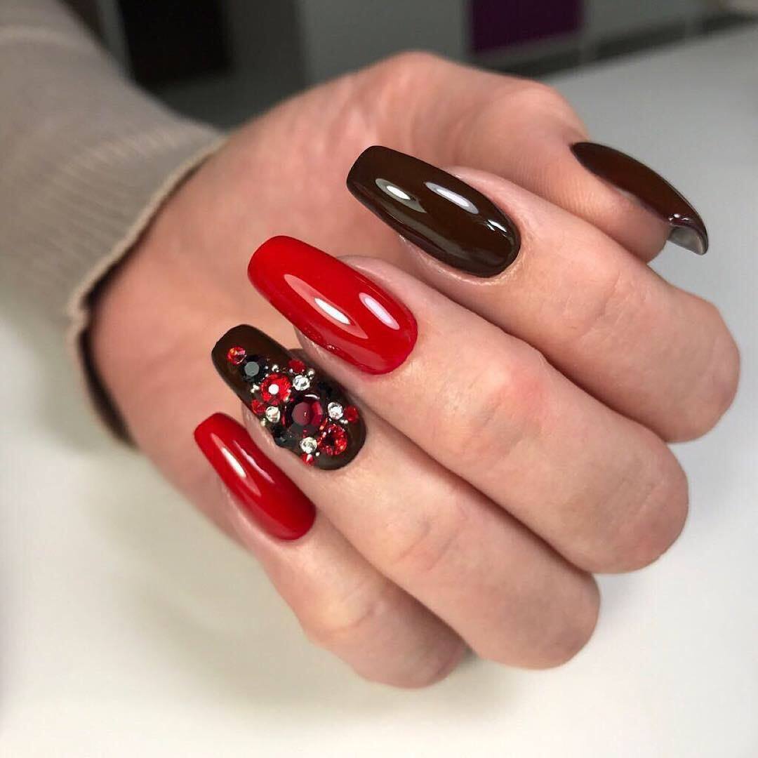 - Модные красные и бордовые оттенки лаков каждый сезон занимают топовою нишу в нейл-арте, дизайн ногтей в этих цветах выглядит очень шикарно и стильно. Эти оттенки идеально сочетаются с золотистыми и серебристыми блестками, а также разными стразами.